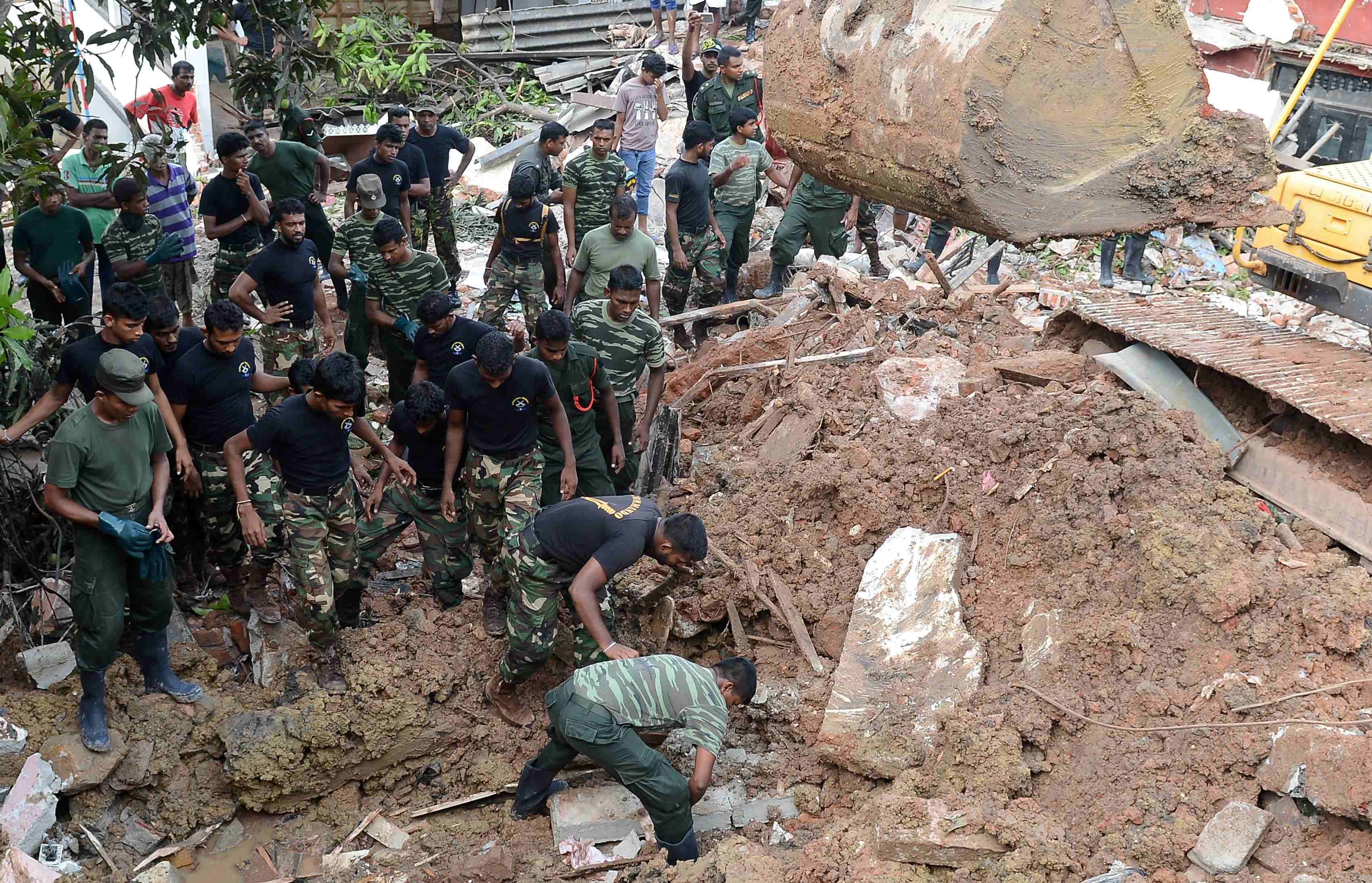 Sri Lankan military rescue workers recover the body of a man during a rescue operation at the site of a collapsed garbage dump in Colombo on April 15, 2017./ AFP Photo