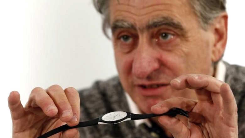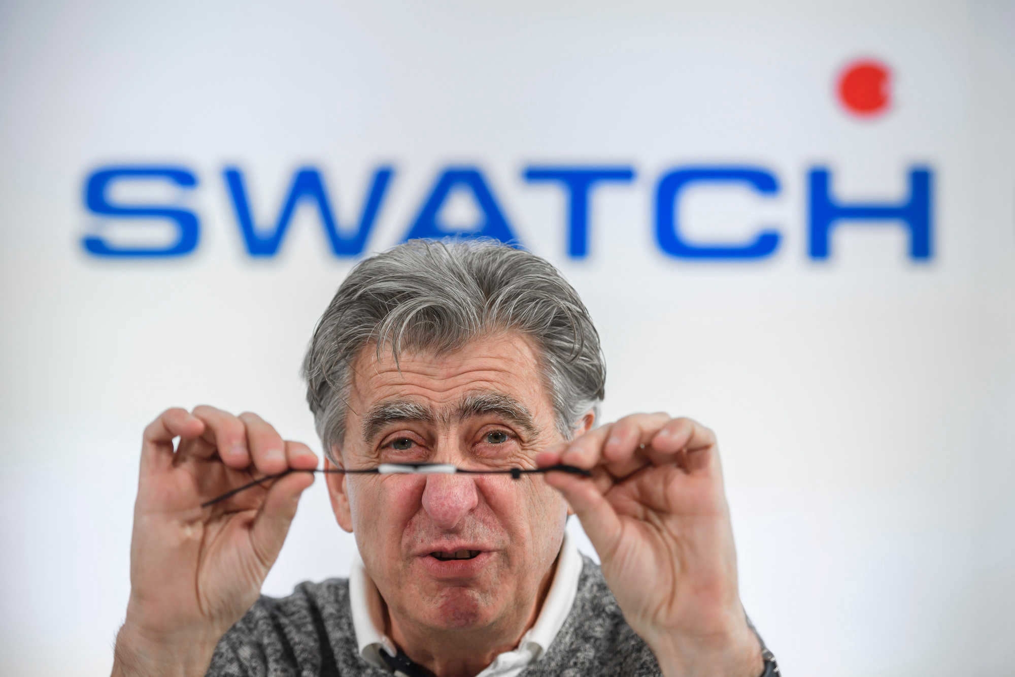 Nick Hayek, CEO of Swiss watchmaker Swatch Group, holds up a new model of a Swatch Skin wristwatch during a press conference to present the group's annual results in Biel on March 16, 2017. /CFP Photo