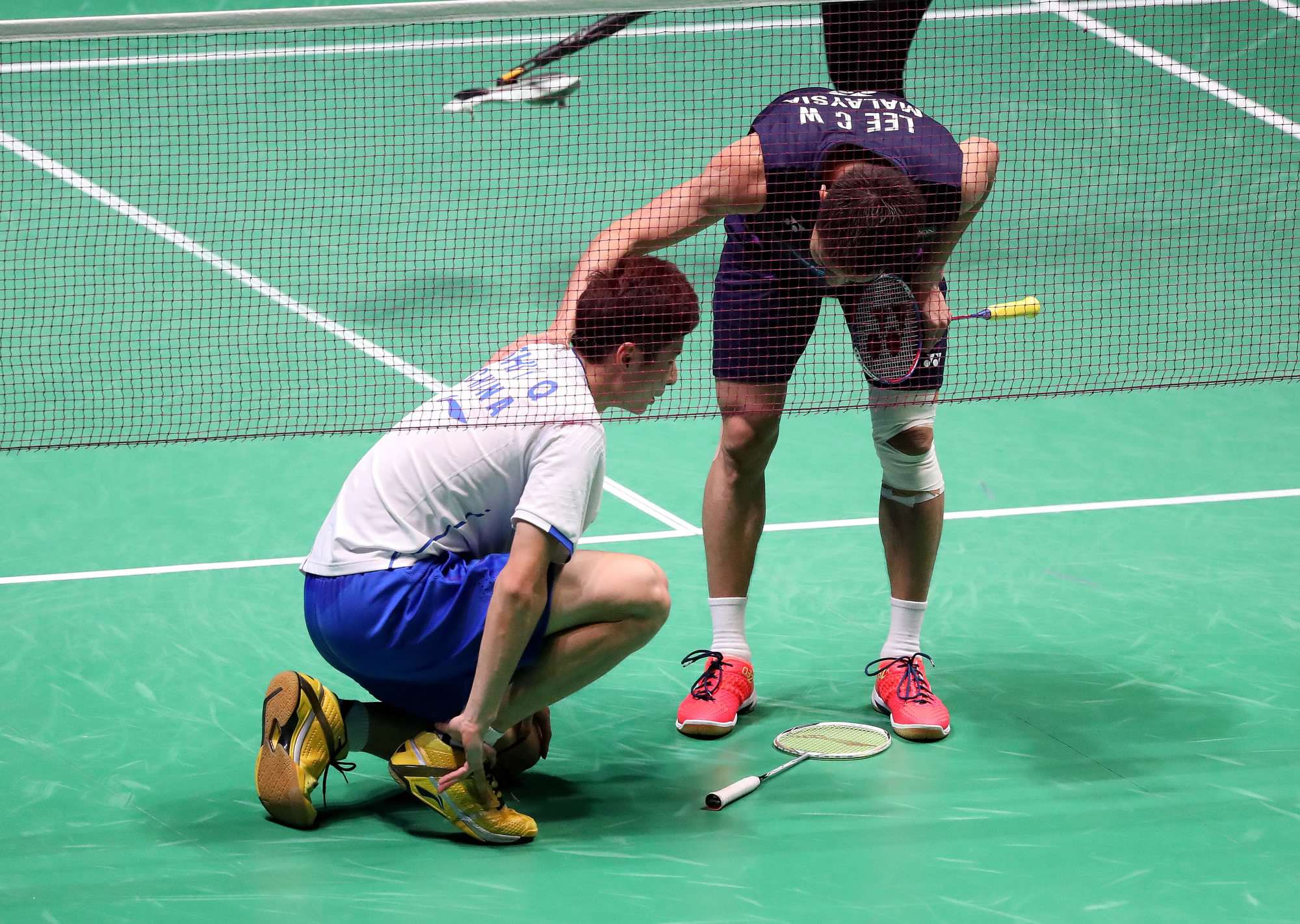 Lee Chong Wei, Malaysia's veteran badminton player, consoles Chinese youngster Shi Yuqi after victory in the All-England Open on March 12, 2017. /CFP Photo