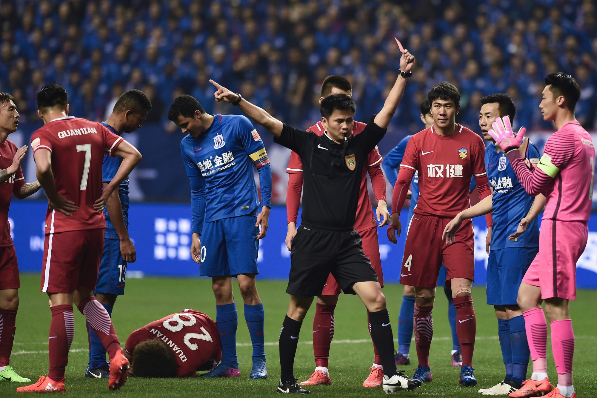 Shanghai Shenhua's Qin Sheng is sent off for stamping on Tianjin Quanjian's Axel Witsel on March 11, 2017. /CFP Photo