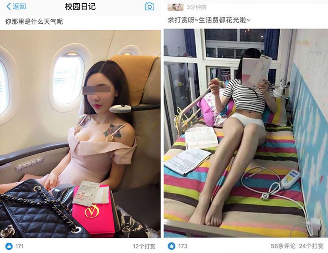 Screenshots from Alipay’s social network “Circles”, “Campus Diary” and “White Collar Diary”, show sexually suggestive photos of female users hoping to make a quick buck.