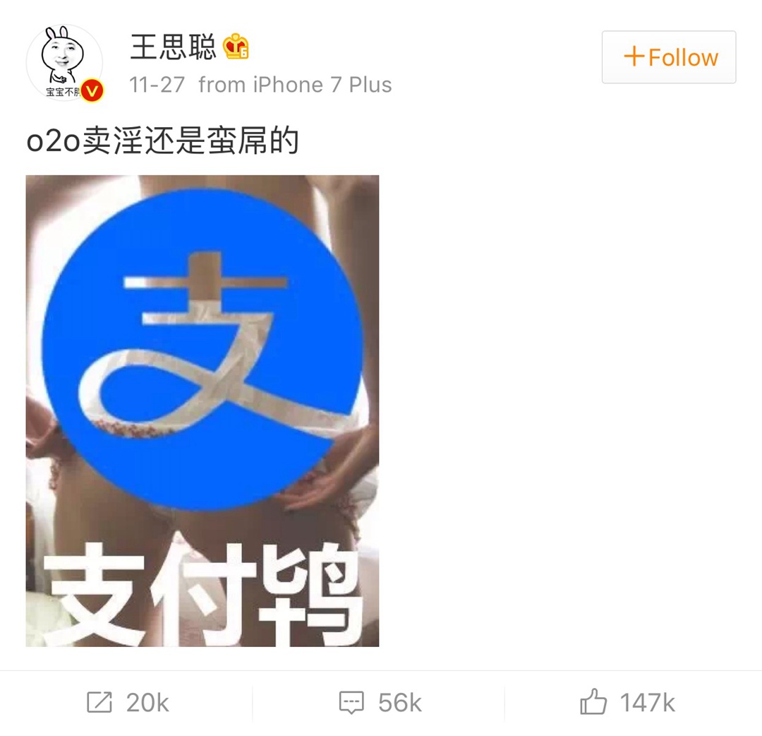 “Online-to-offline prostitution is pretty cool,” Wang Sicong, the son of China’s richest man and real-estate magnate Wang Jianlin, wrote tongue in cheek and posted a photo of the Alipay logo superimposed over a nearly-naked woman on his verified Weibo account.