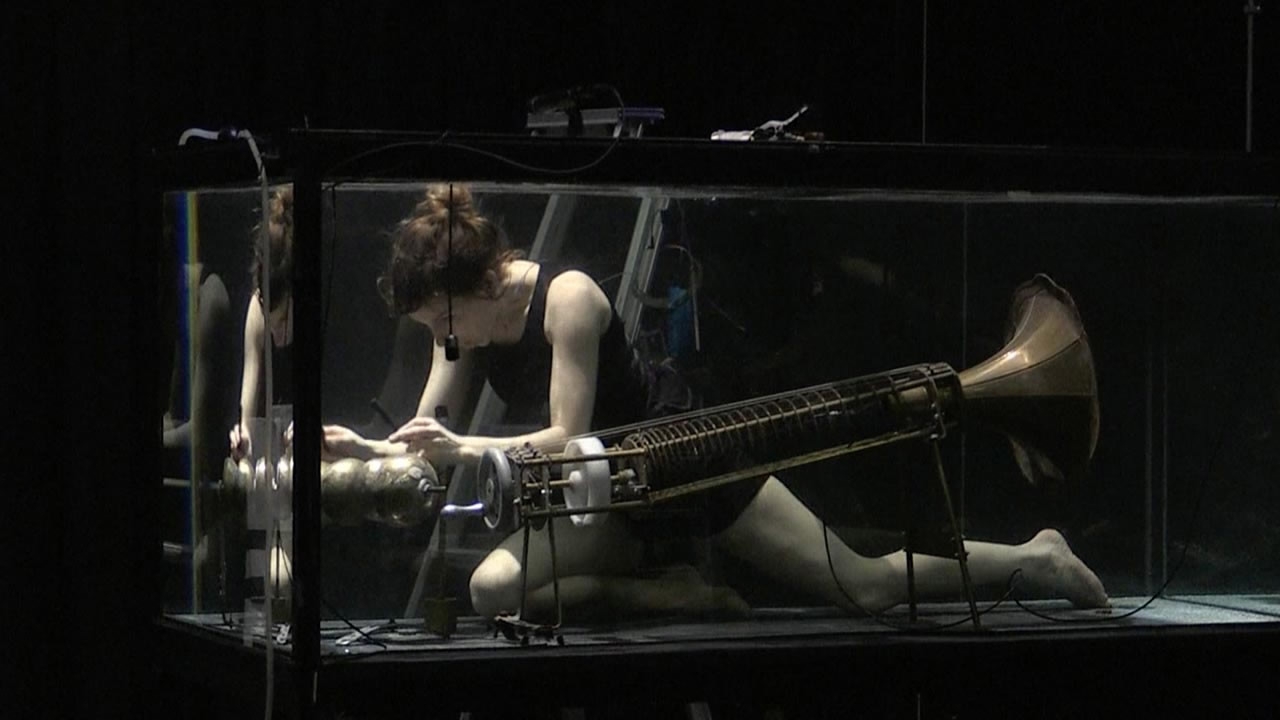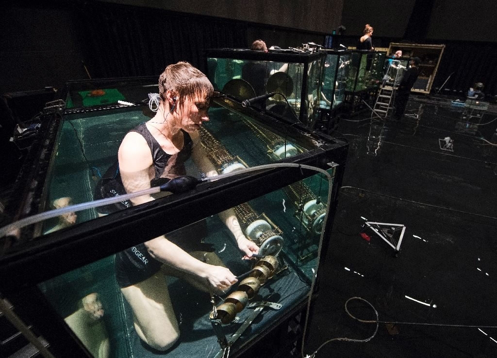 Musicians in aquariums make sounds in a silent world