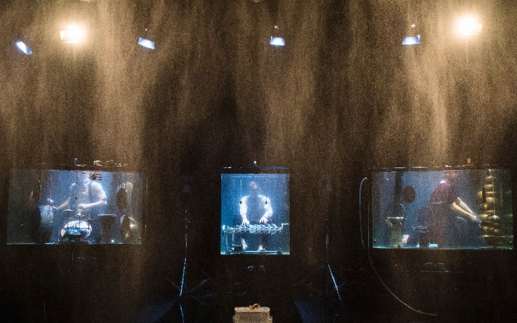 The Between Music band with custom-made instrument perform music in glass water tanks that resembles the sounds whales make. /AFP Photo