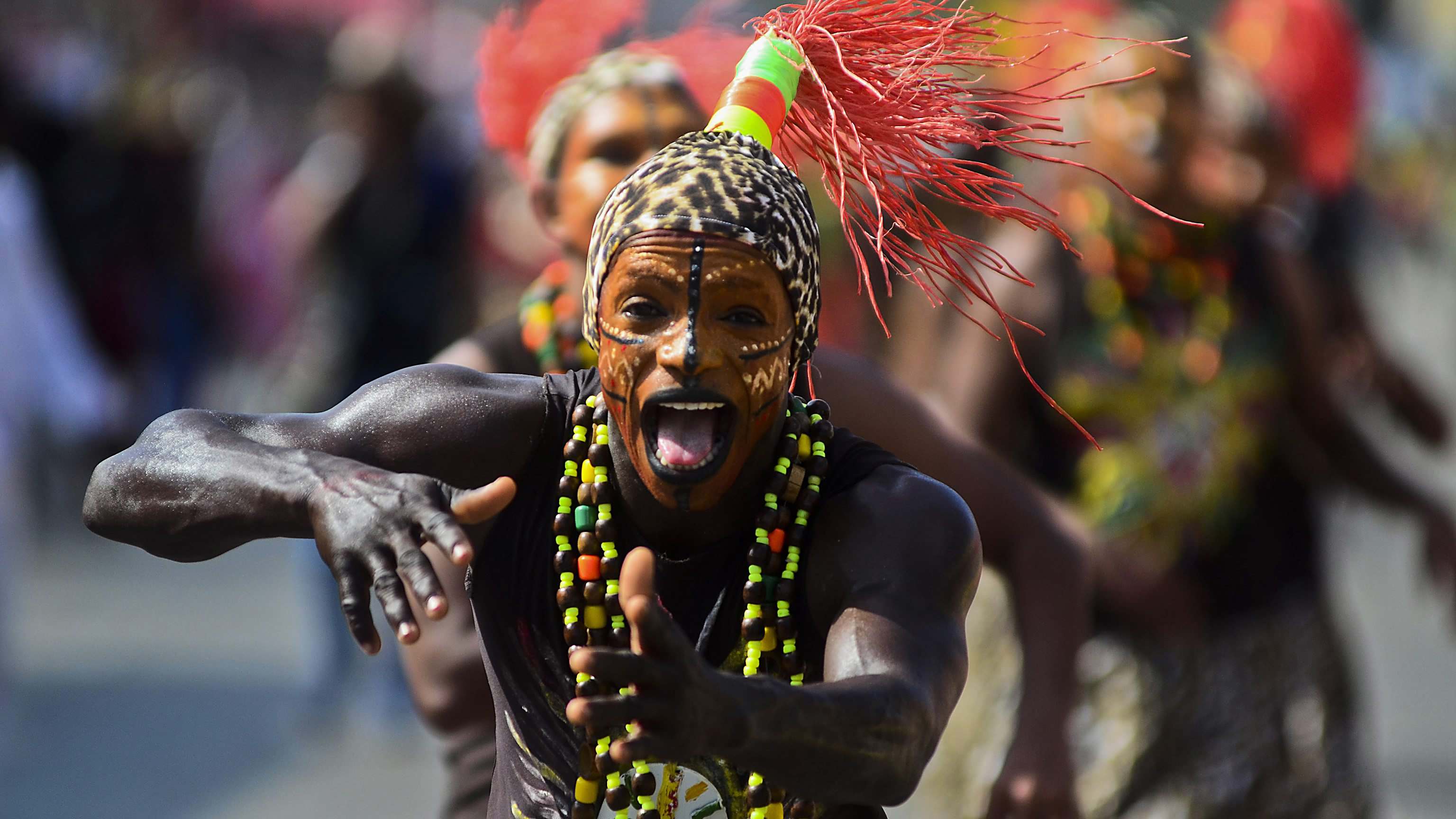 Revelers perform during the Carnival parade in Barranquilla, Colombia on February 15, 2015. /AFP Photo