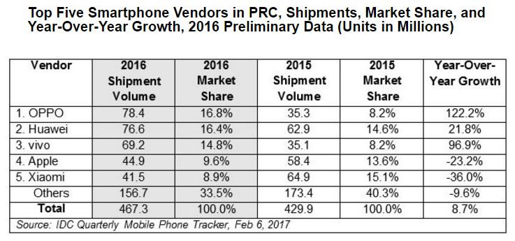 According to IDC, China's smartphone market grew 9 percent last year, more than three times faster than the 2.5-percent growth rate of 2015. The total shipment volume reached 467.3 million devices.