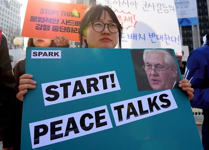 A South Korean activist holds a placard showing a portrait of US Secretary of State Rex Tillerson during a rally against the planned deployment of THAAD in Seoul on March 17, 2017. /VCG Photo