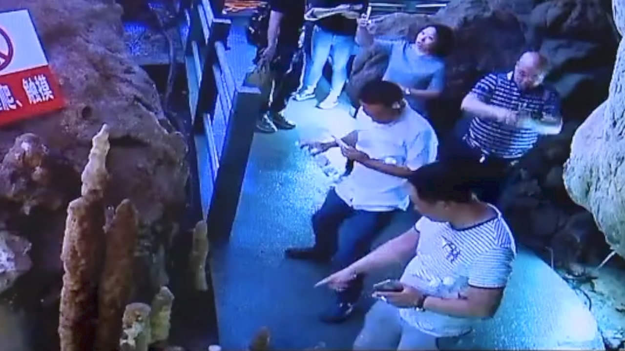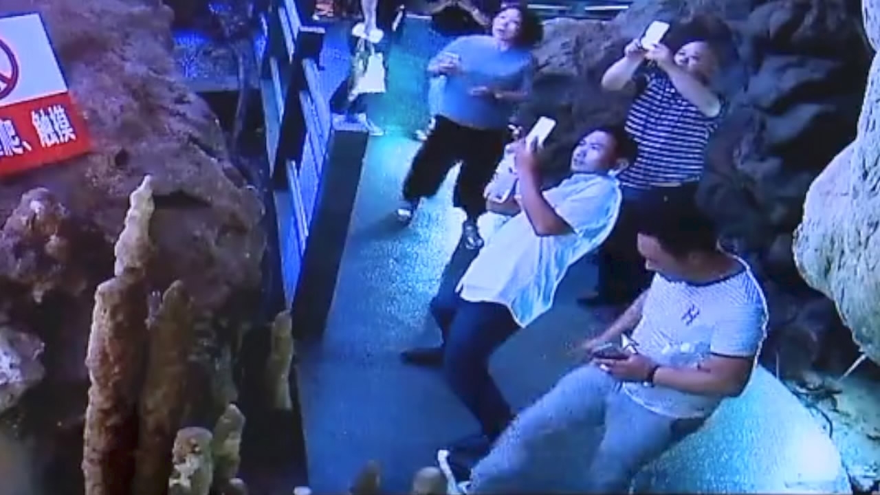 A surveillance camera captured a male tourist in a white shirt intentionally kicking a 30 centimeter-tall limestone stalagmite in the Qianlongdong Scenic Areas on Monday, showing a flagrant disregard for signs warning visitors not to climb or touch the rock features. Tourists took photos and watched on as he kicked the stalagmite three times. The man and his companions left the broken stalagmite behind as they nonchalantly walked away.