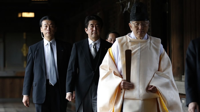 Japanese Prime Minister Shinzo Abe (C) visits the Yasukuni Shrine in Tokyo, Japan on December 26, 2013. /Xinhua Photo