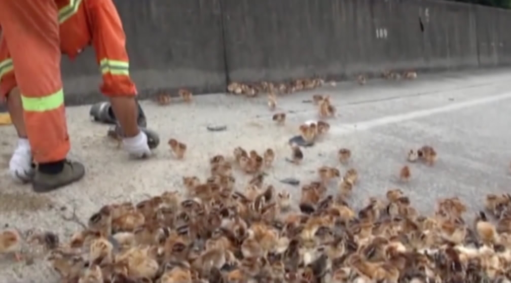 In the aftermath of the accident, rescue workers can be seen scooping dozens of chicks at a time with shovels. According to local reports, the driver was injured but is now recovering. It's not known how many of the chicks were killed, but the video suggests many survived.