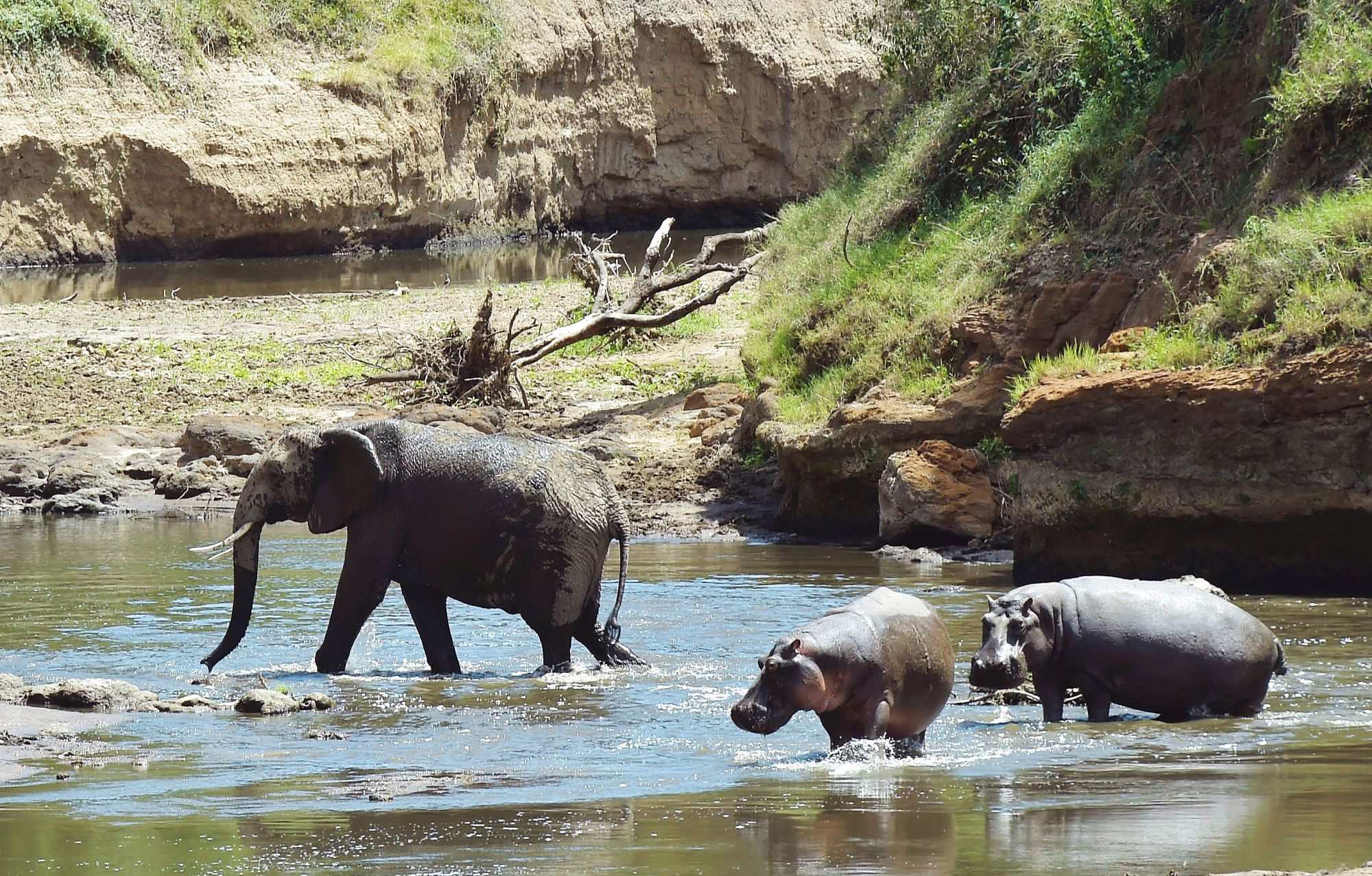 A family of elephants walk pass hippopotamus through the dried out Mara River in the Mara basin on February 13, 2017 in southwest Kenya and is one of Africa's greatest Wildlife Reserves. /CFP Photo
