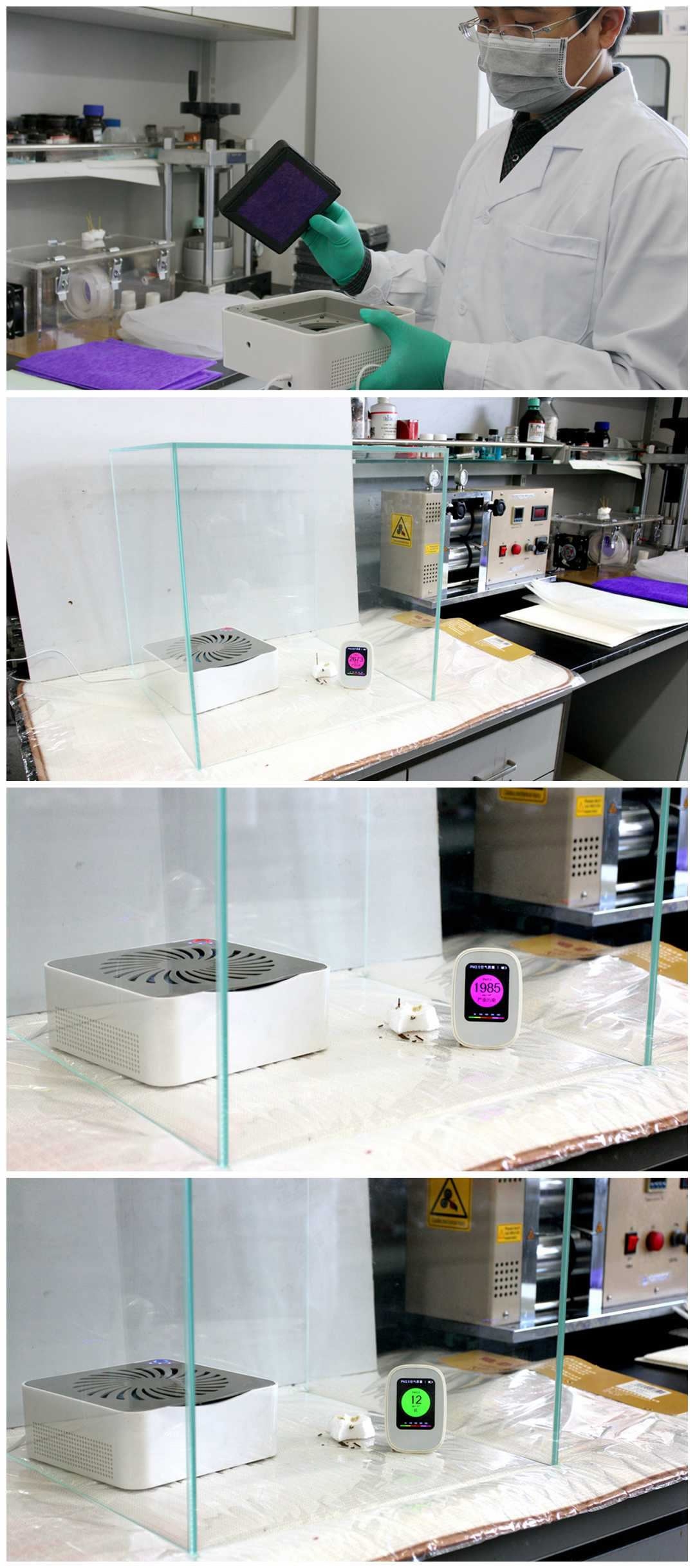 The experiment shows how a MOF filter purifies air in a closed space. /Photos provided by Feng Xin
