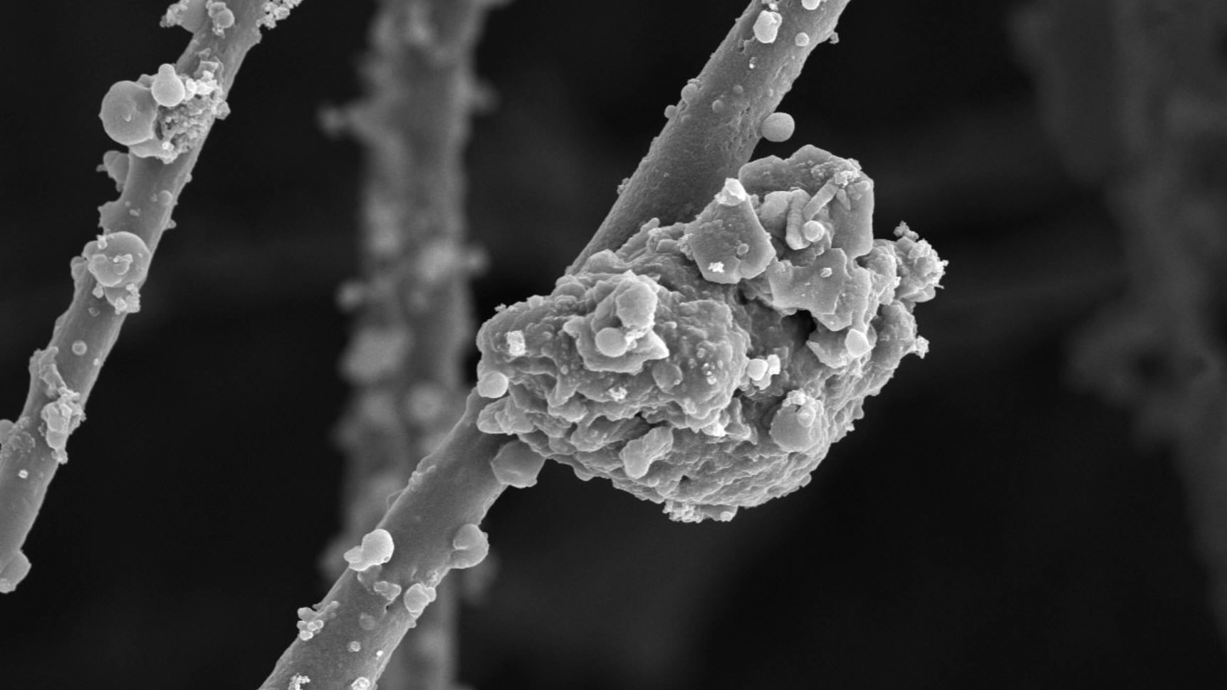 Microscopic image of fibers wrapped with MOFs capturing PM 2.5 particles. /Photo provided by Wang Bo