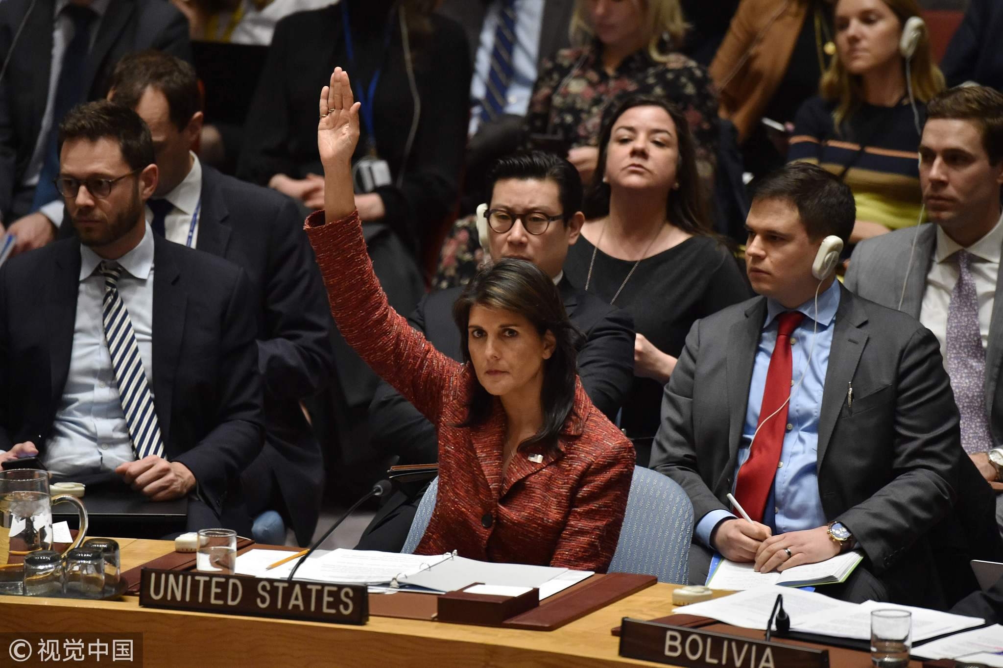 US ambassador to the United Nations, Nikki Haley (C) votes in favor to create an investigation of the use of weapons in Syria, at United Nations Headquarters in New York, on April 10, 2018. /VCG Photo.