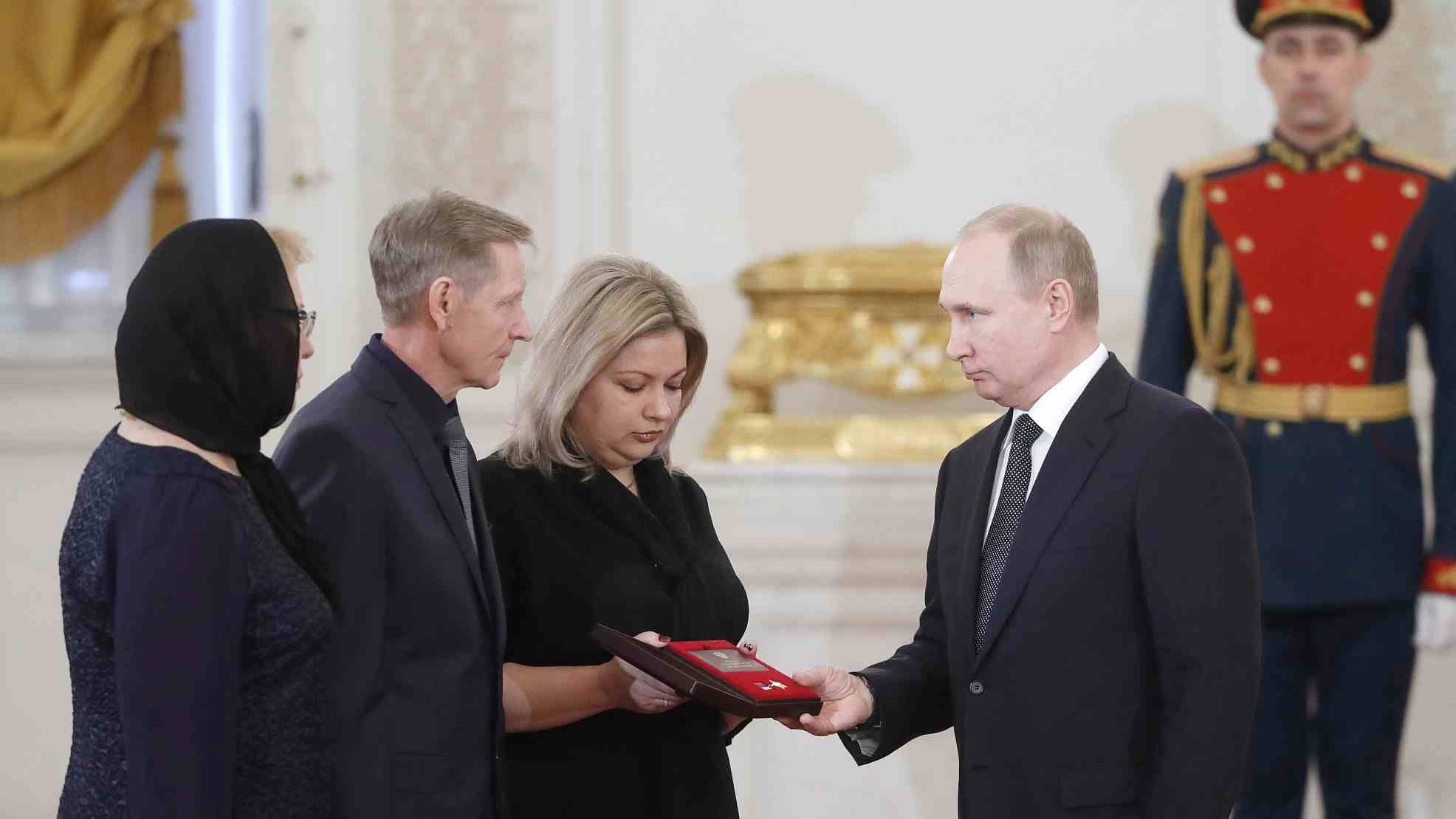 Russia's President Vladimir Putin (R) gives a Gold Star medal of the Hero of the Russian Federation to relatives of the late pilot Roman Filipov who was killed in Syria, during a ceremony to present state awards at the Moscow Kremlin on February 23, 2018. /VCG Photo