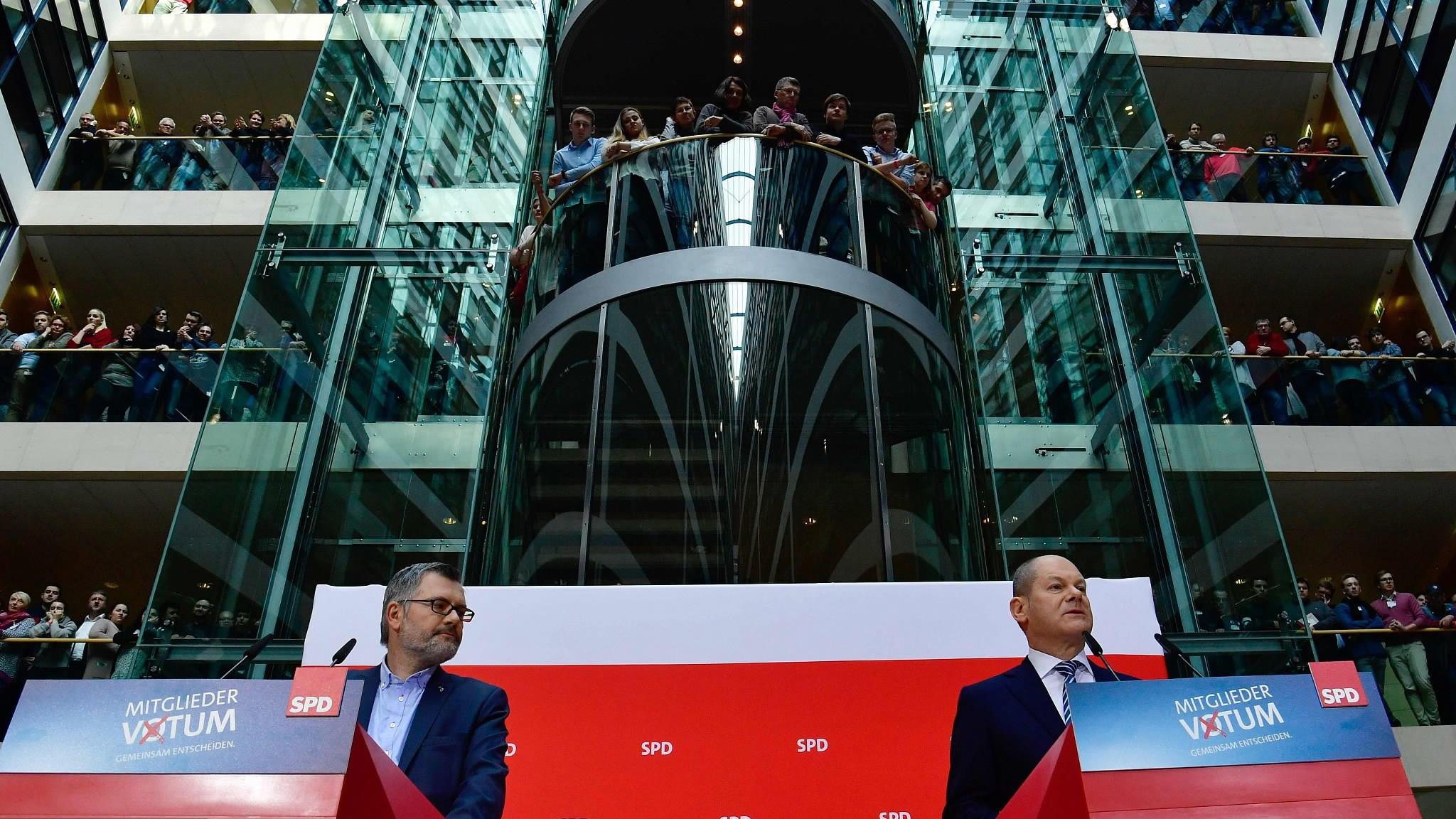 Dietmar Nietan (L), treasurer of Germany's Social Democrats (SPD) party, and SPD members look on as Olaf Scholz (R), interim leader, comments on the decision ofe SPD party members to join a new coalition government with German Chancellor Angela Merkel's conservatives at the SPD headquarters in Berlin on March 4, 2018. /VCG Photo