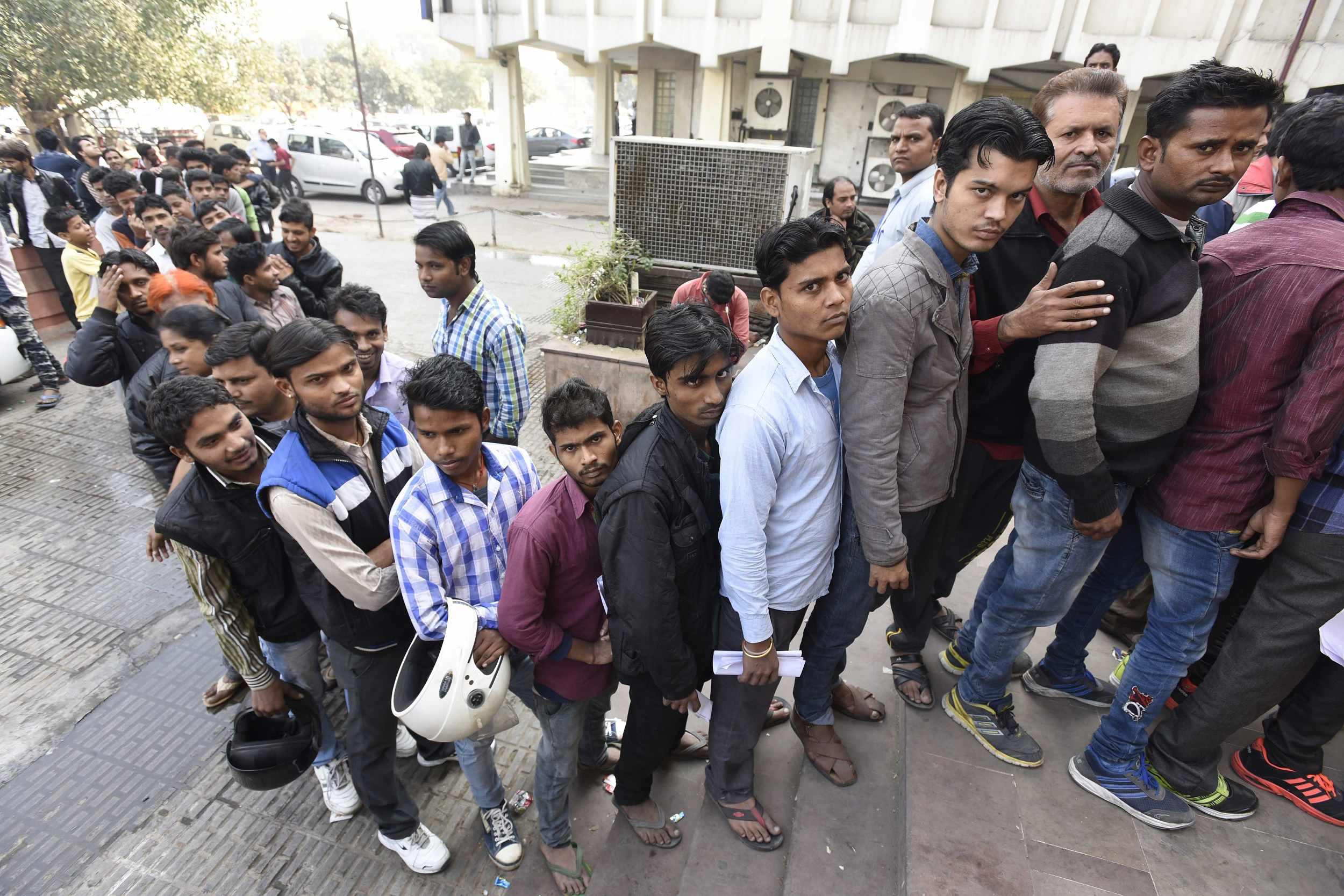 People stand in a queue outside banks to deposit and exchange old denomination Indian rupee 500 and 1000 currency notes November 24, 2016 in New Delhi, India. /VCG Photo