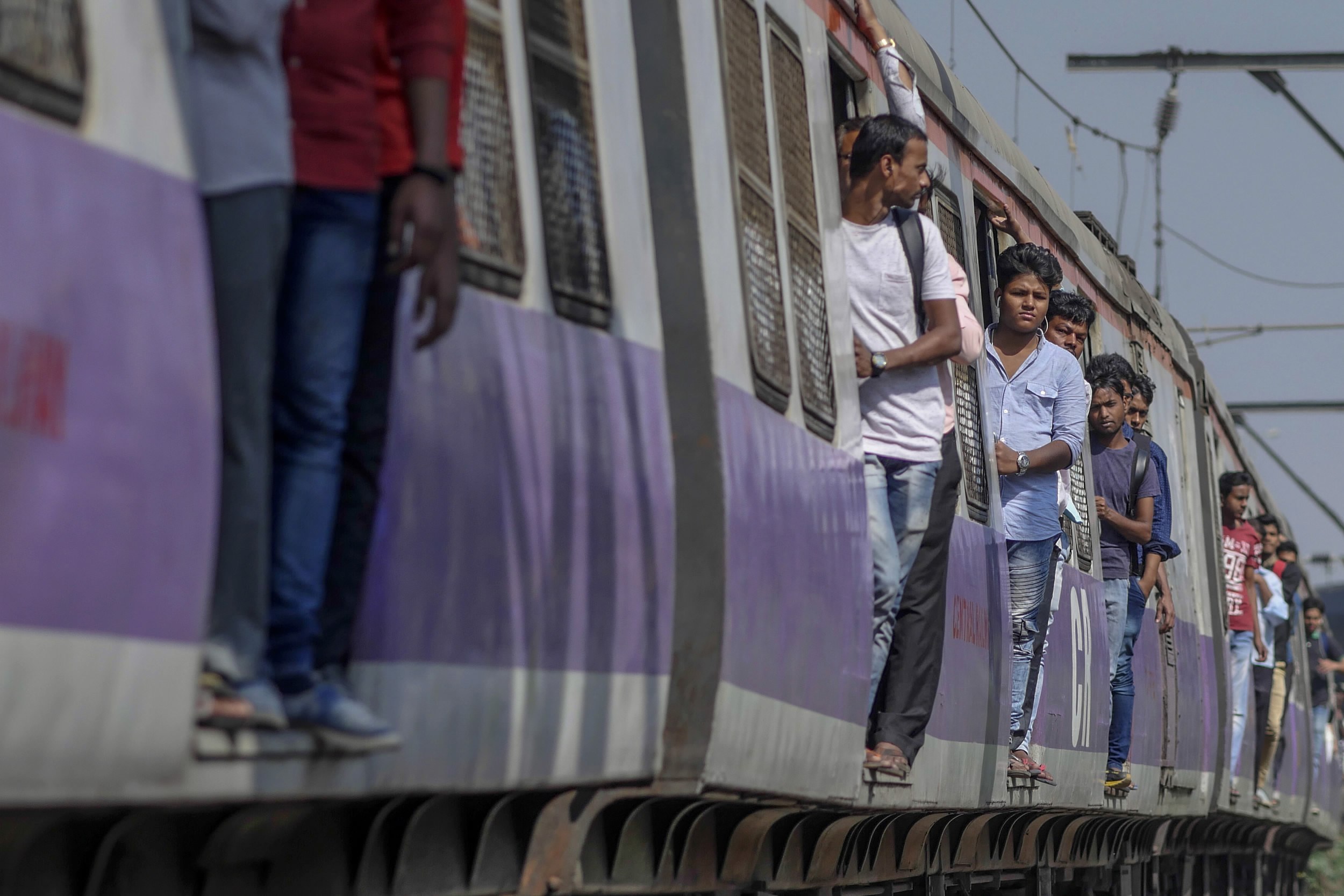 Passengers stand in the doorways of train carriages as the train arrives at Sewri railway station in Mumbai, India, on Saturday, Jan. 27, 2018. India has an expansive, but overcrowded and aging railway network. /VCG Photo