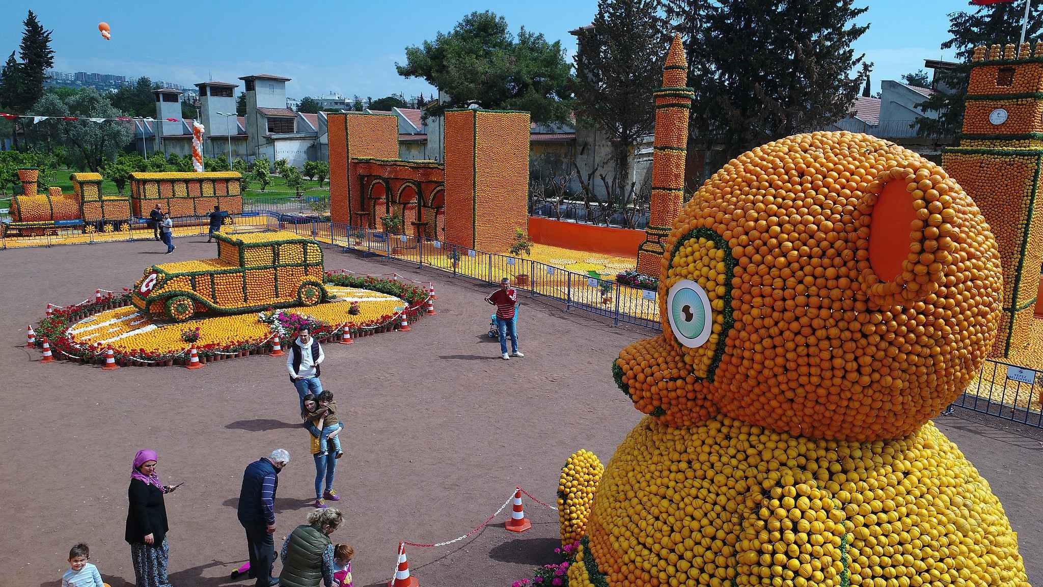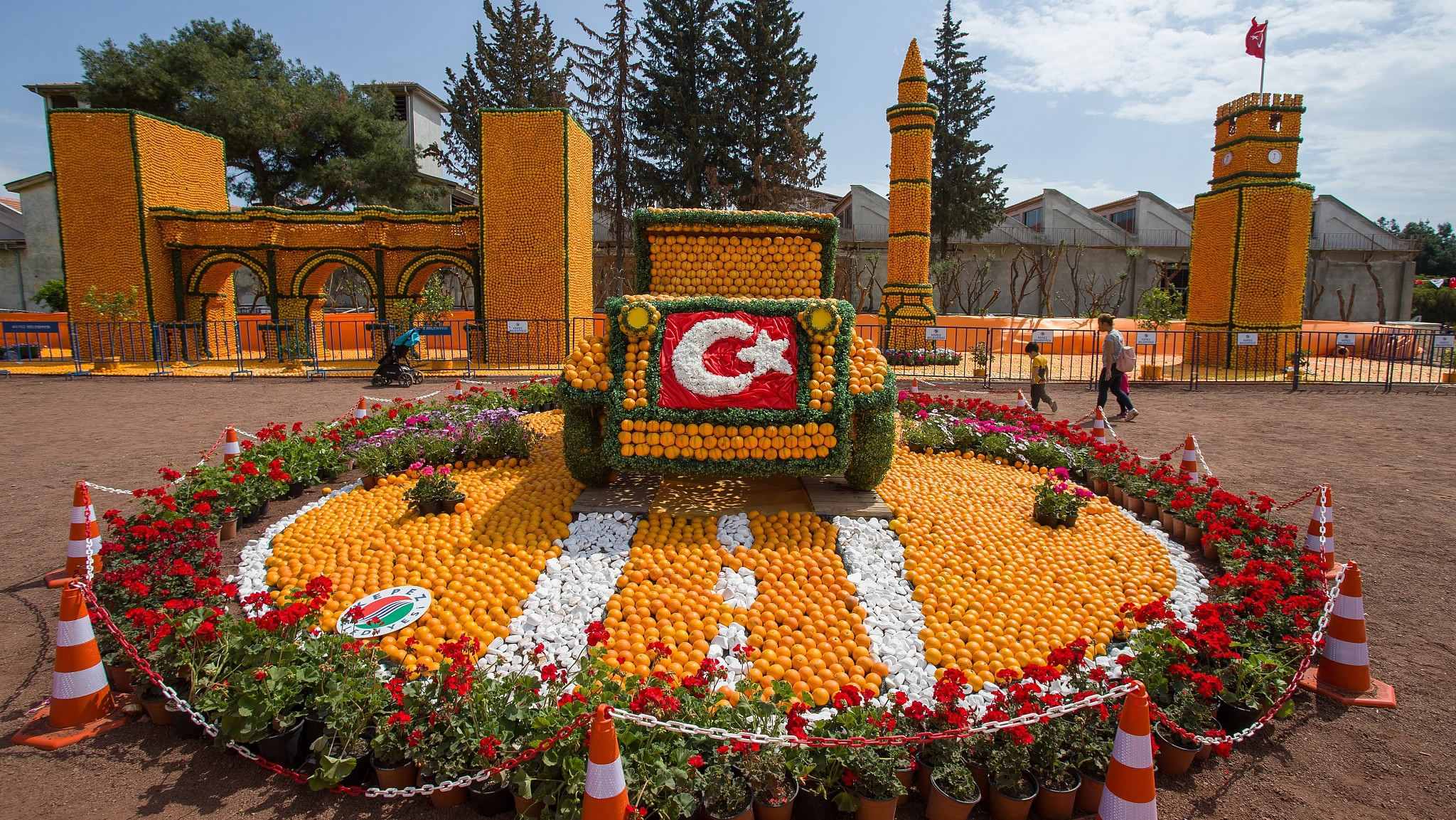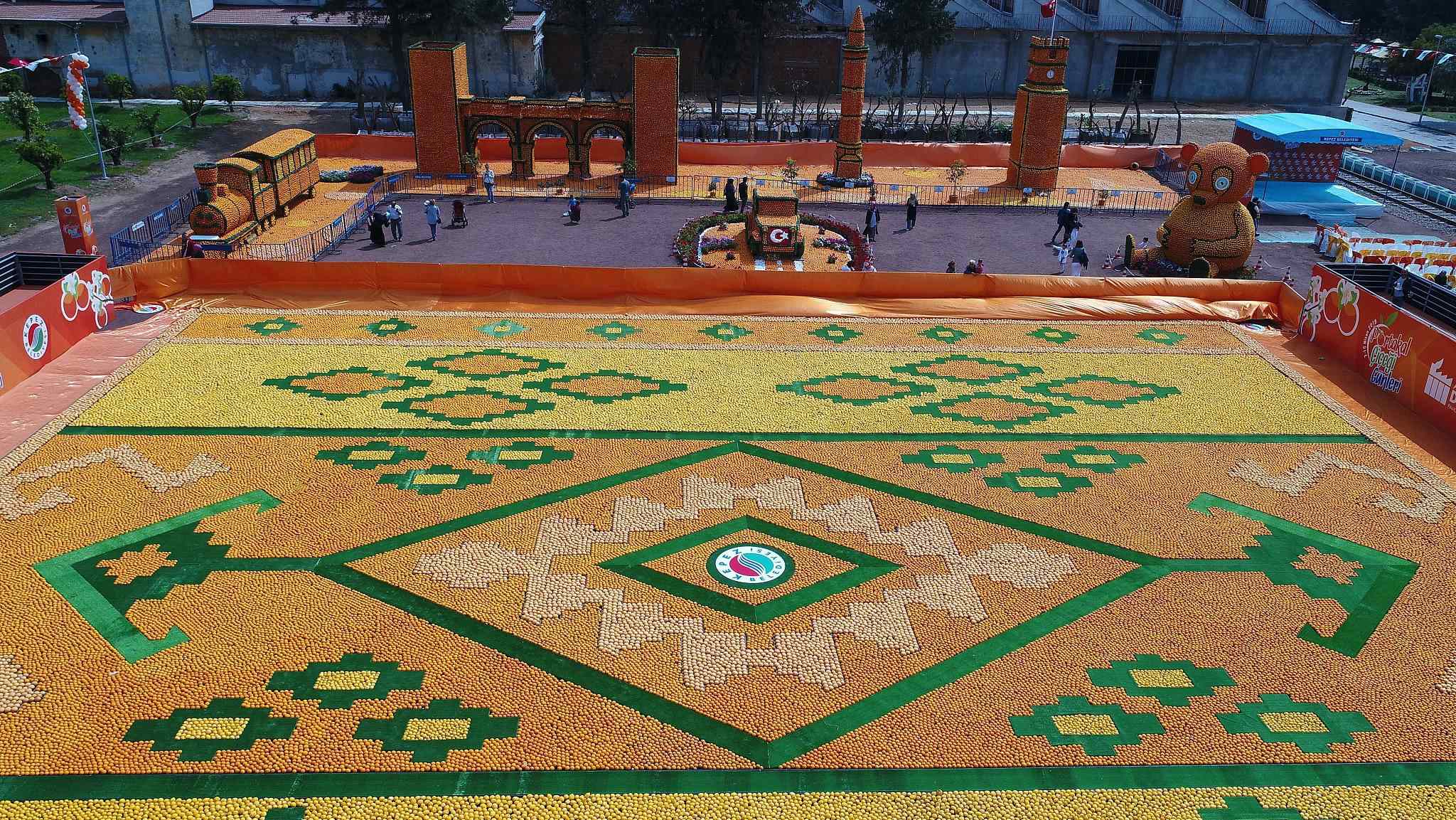 The unique scent of orange lingers in the air during the Orange Blossom Carnival in Antalya, Turkey on Monday. The annual event featured a 1071-meter-long rug pattern made from 50 tons of oranges, lemons and grapefruits as well as replicas of local monuments. /VCG Photo