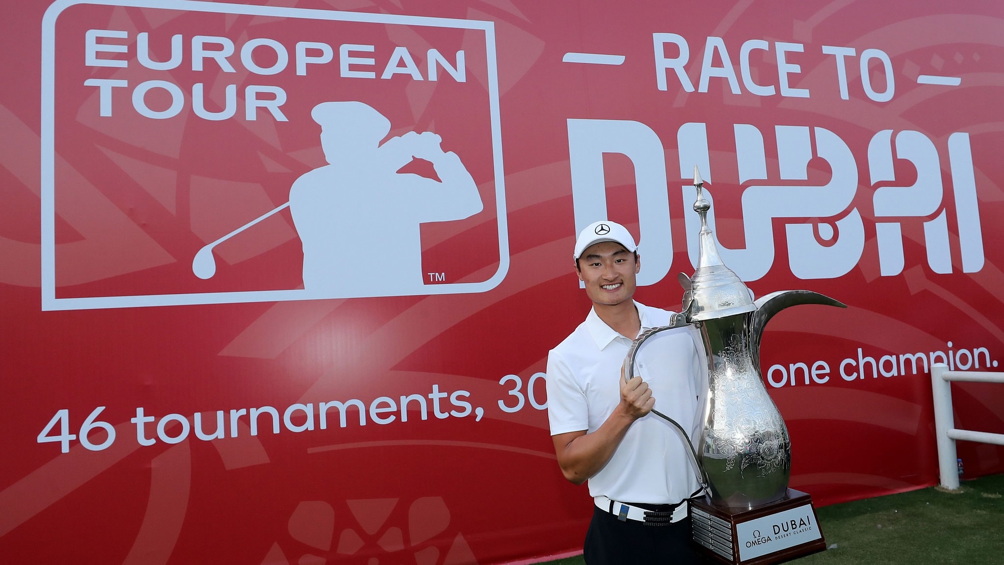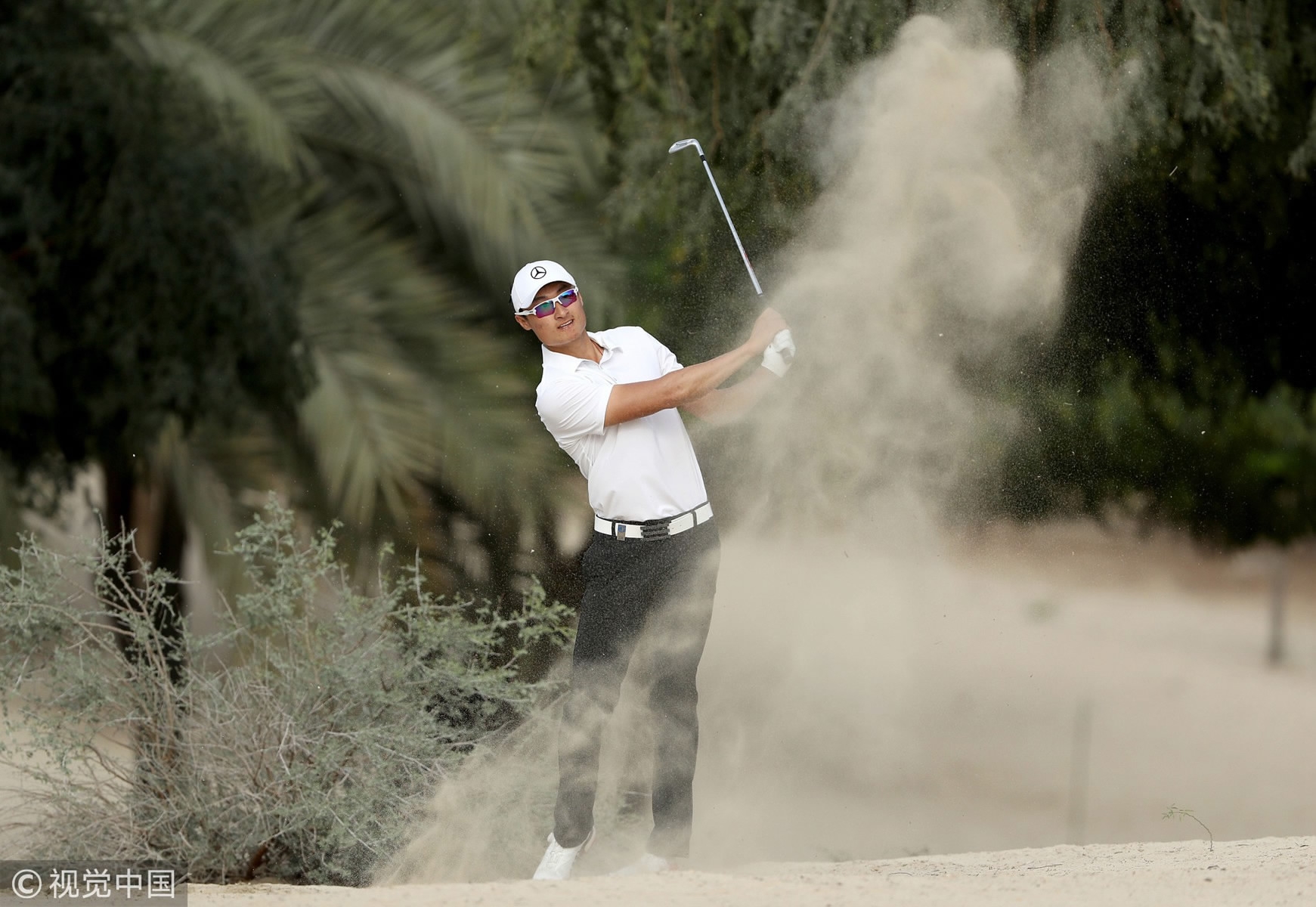 Li Haotong of China plays during the final round of the Dubai Desert Classic on the Majlis Course at Emirates Golf Club on Jan. 28, 2018 in Dubai. /VCG Photo