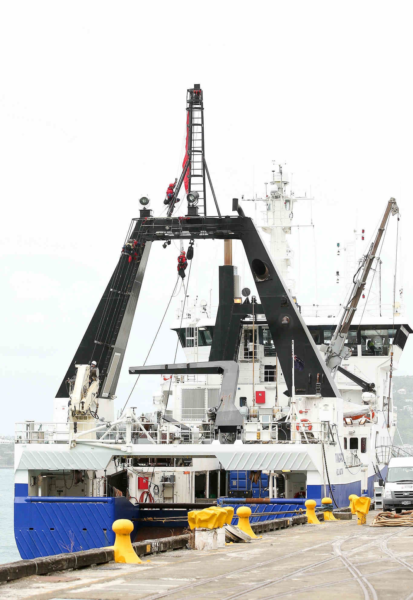 November 24, 2015: Greenpeace activists look on after scaling the NIWA research vessel Tangaroa in Wellington, New Zealand. Five activists stormed the research vessel Tangaroa in the morning, chaining themselves to the decks in order to stop the ship from heading offshore looking for oil. /VCG Photo