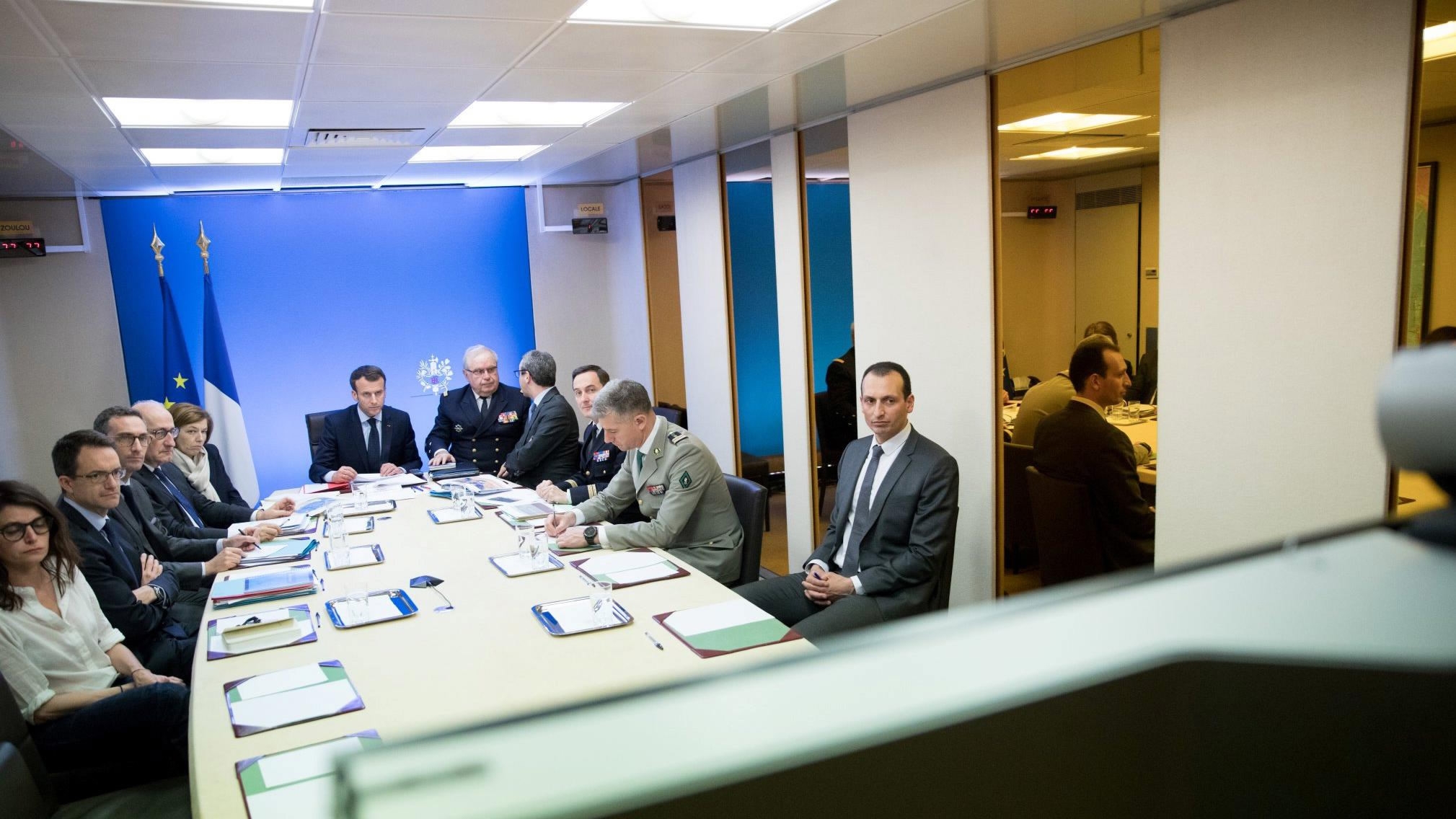 French President Emmanuel Macron attends a meeting as part of the joint airstrike operation by the British, French and US militaries in this picture obtained on April 14, 2018 via social media. /Reuters Photo