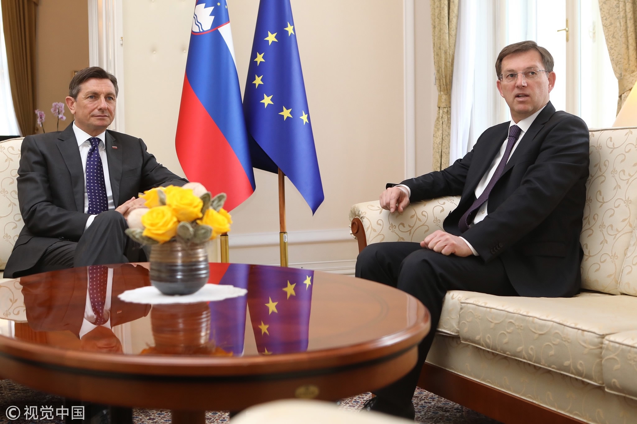 Slovenian Prime Minister Miro Cerar (R) holds a meeting with Slovenian President Borut Pahor (L) to declare his resignation in Ljubljana, Slovenia, on March 15, 2018. /VCG Photo
