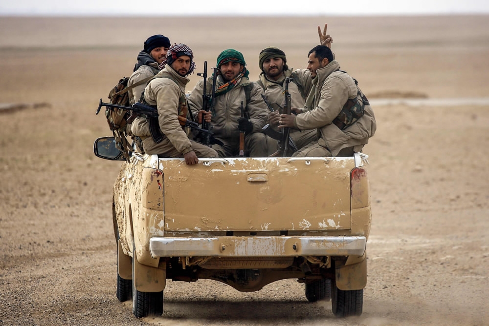 Members of the Syrian Democratic Forces (SDF) ride in an armored vehicle 20km north of Raqa, during their offensive towards ISIL's Syrian stronghold on Thursday. /VCG Photo