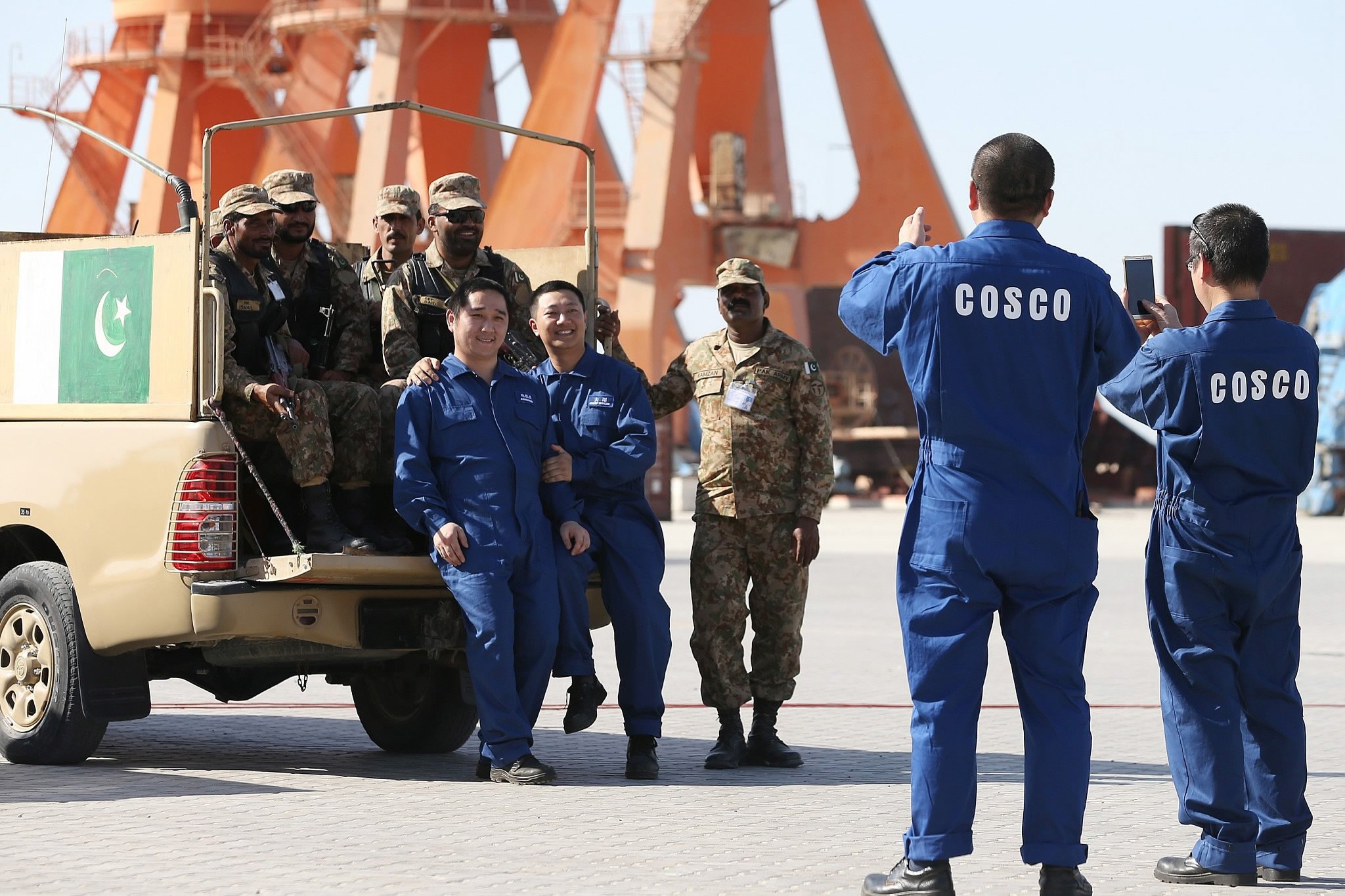 Pakistani soldiers and Chinese staff pose for a photo together during the opening of a trade project in Gwadar port, west of Karachi, on November 13, 2016. The port is a key part of the China-Pakistan Economic Corridor (CPEC). /VCG Photo
