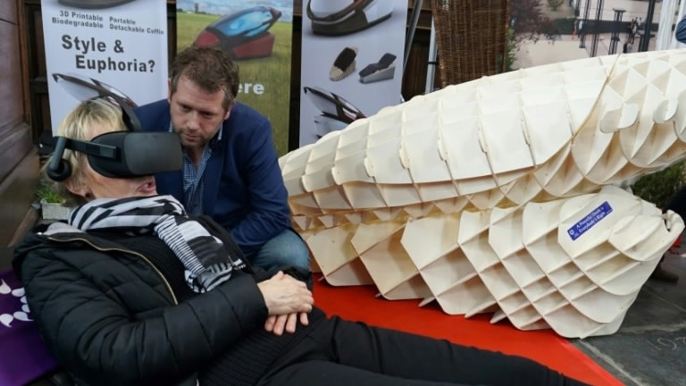 A woman experiences the inside of the "Sarco" suicide device through using virtual reality glasses on April 14, 2018 at the Amsterdam Funeral Expo. /VCG Photo