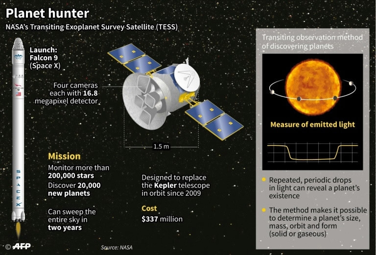 A graphic explains key facts about Nasa's TESS telescope as it prepares for launch on a mission to find the nearest Earth-like planets. /AFP Photo