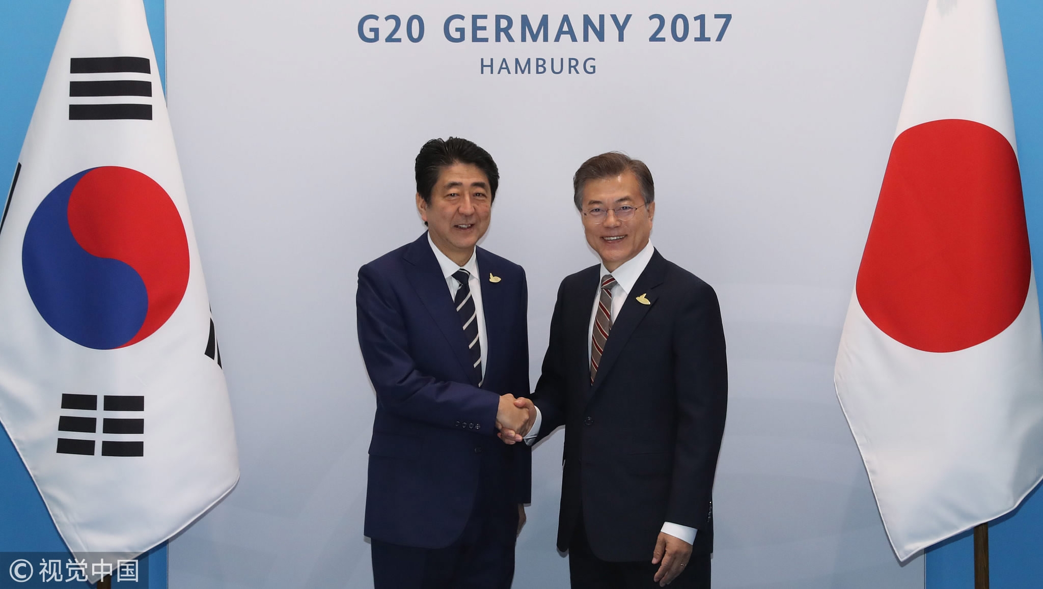 S. Korean President Moon Jae-in and Japanese Prime Minister Shinzo Abe shake hands in Hamburg, Germany, on July 7, 2017, on the sidelines of Group of 20 summit talks. /VCG Photo