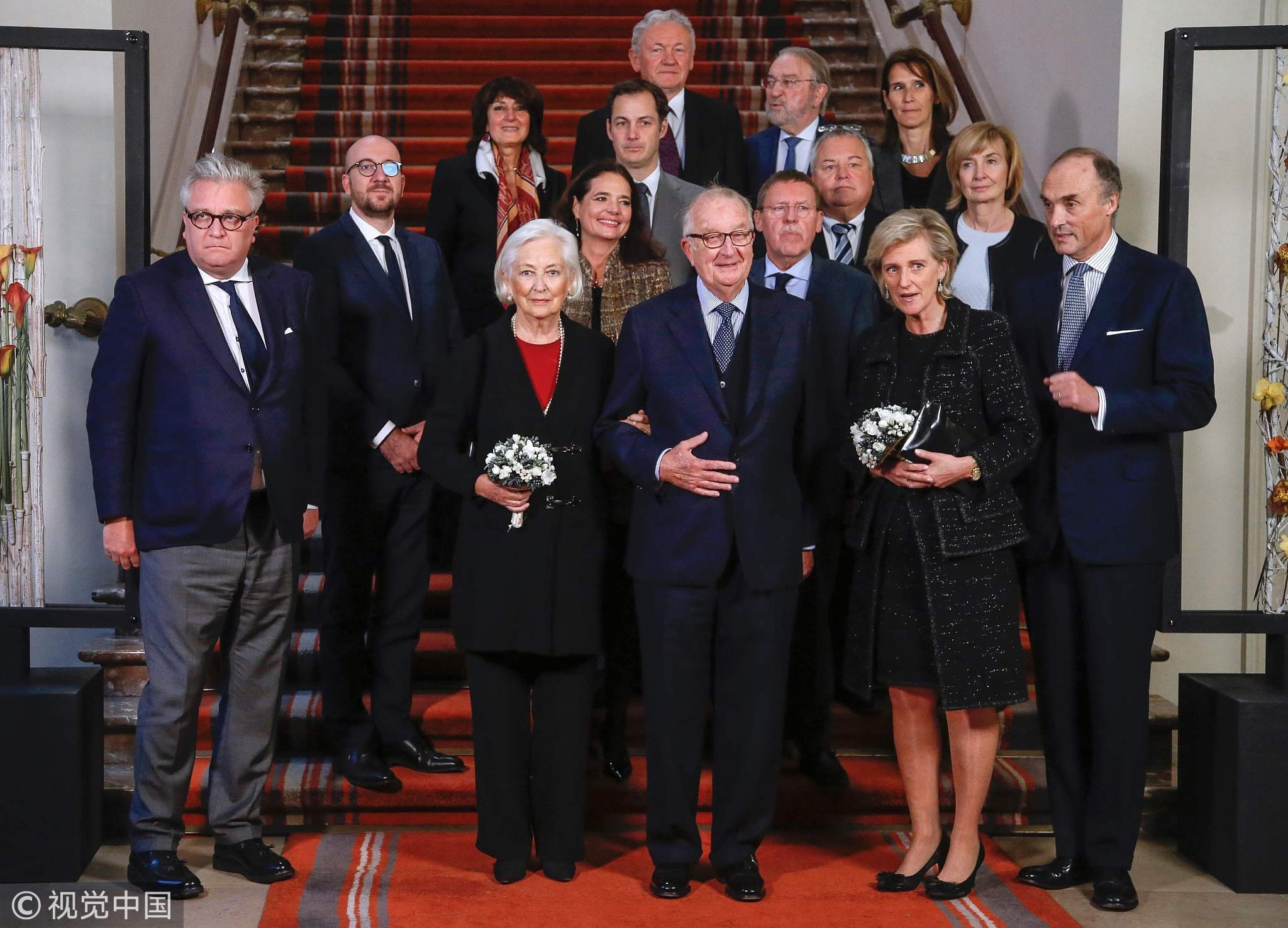 Queen Paola and King Albert II of Belgium pose with members of the royal family and of the government, including Prime Minister Charles Michel (2nd L) in Brussels, November 15, 2016. /VCG Photo