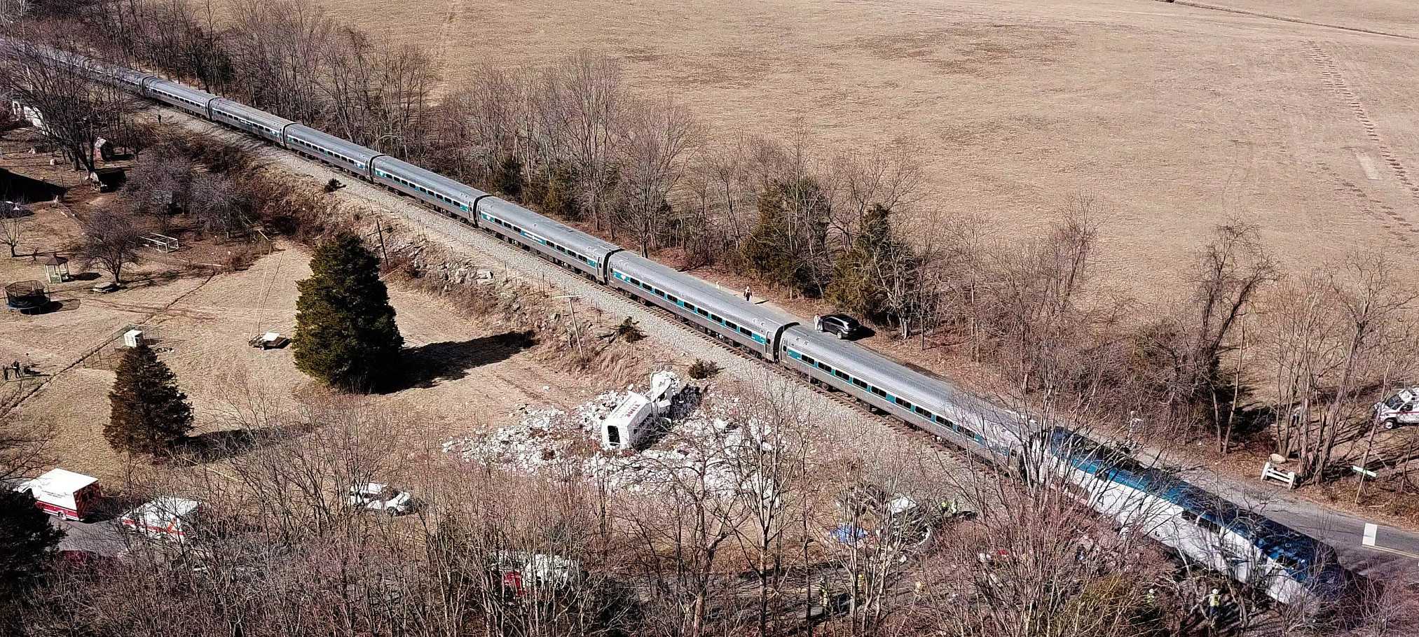 The wreckage of a garbage truck lies beside an Amtrak passenger train after a collision in Crozet, Virginia, US. /VCG Photo
