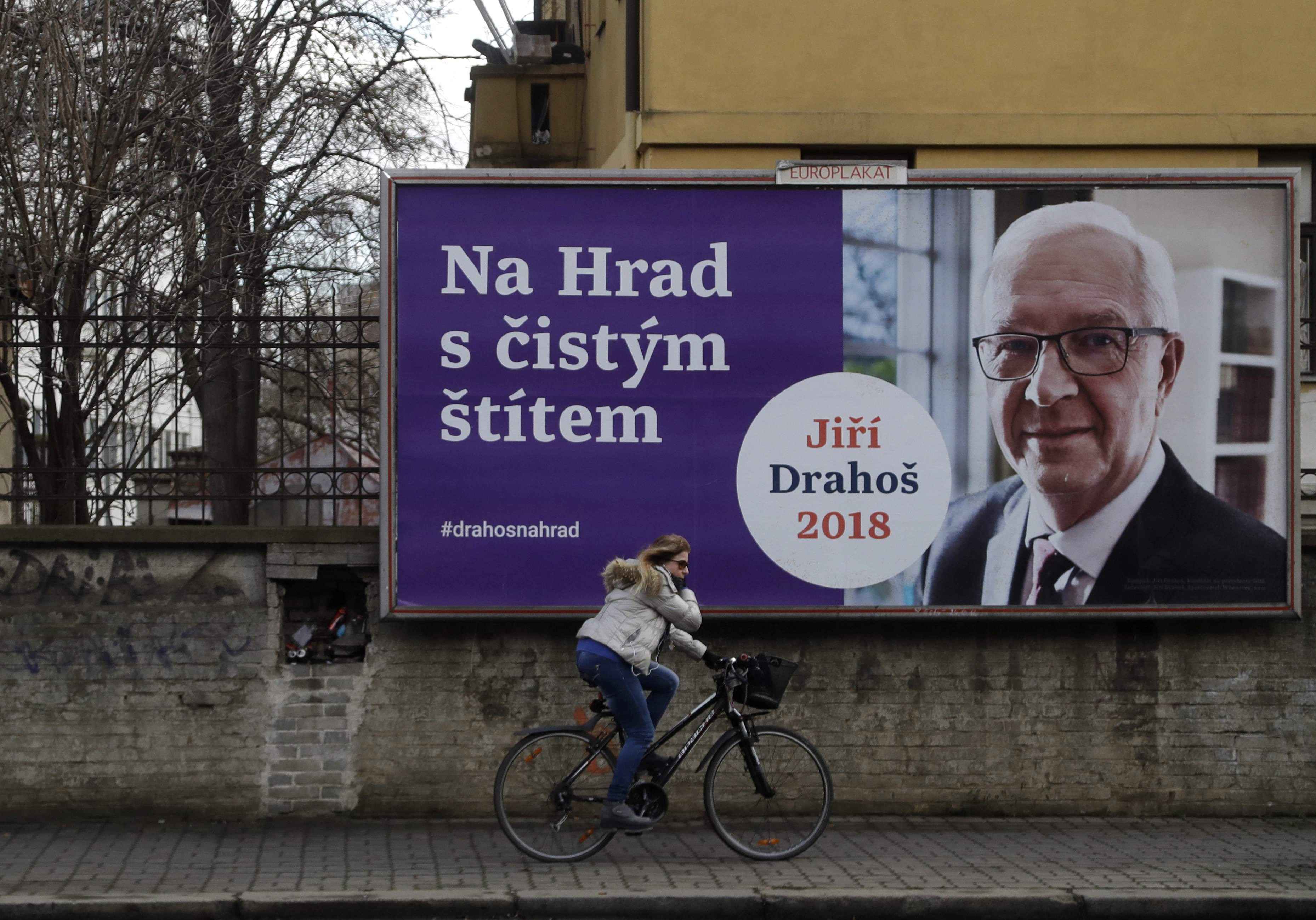 A cyclist rides past a poster for presidential candidate Jiri Drahos in Prague on Jan. 24, prior the second round of voting. /AP Photo