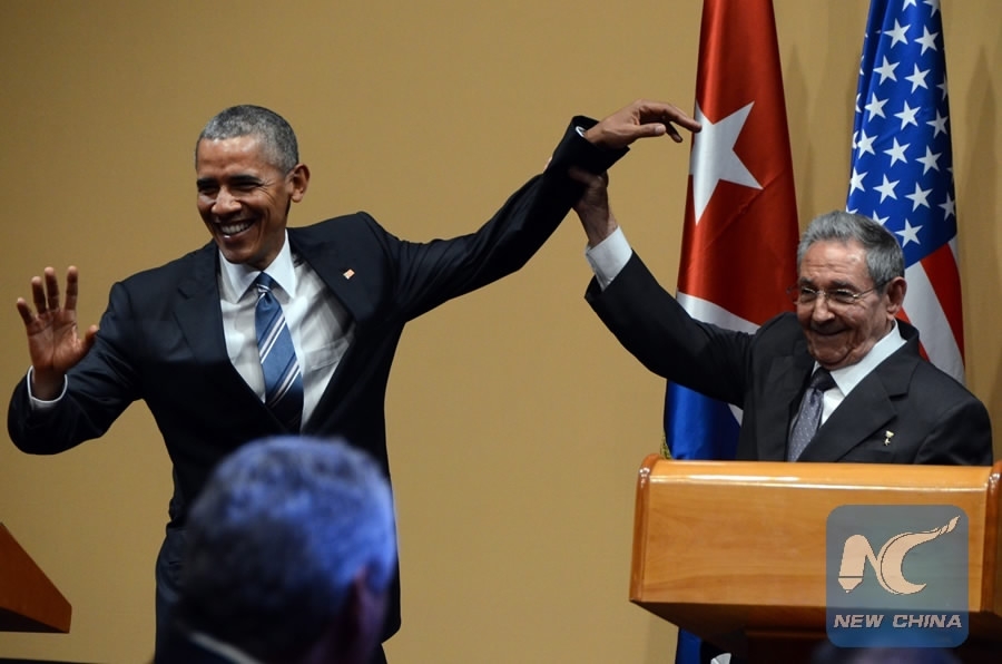 Cuba's President Raul Castro (R) and then US President Barack Obama reacting at a press conference at the Revolution Palace in Havana on March 21, 2016. /Xinhua Photo
