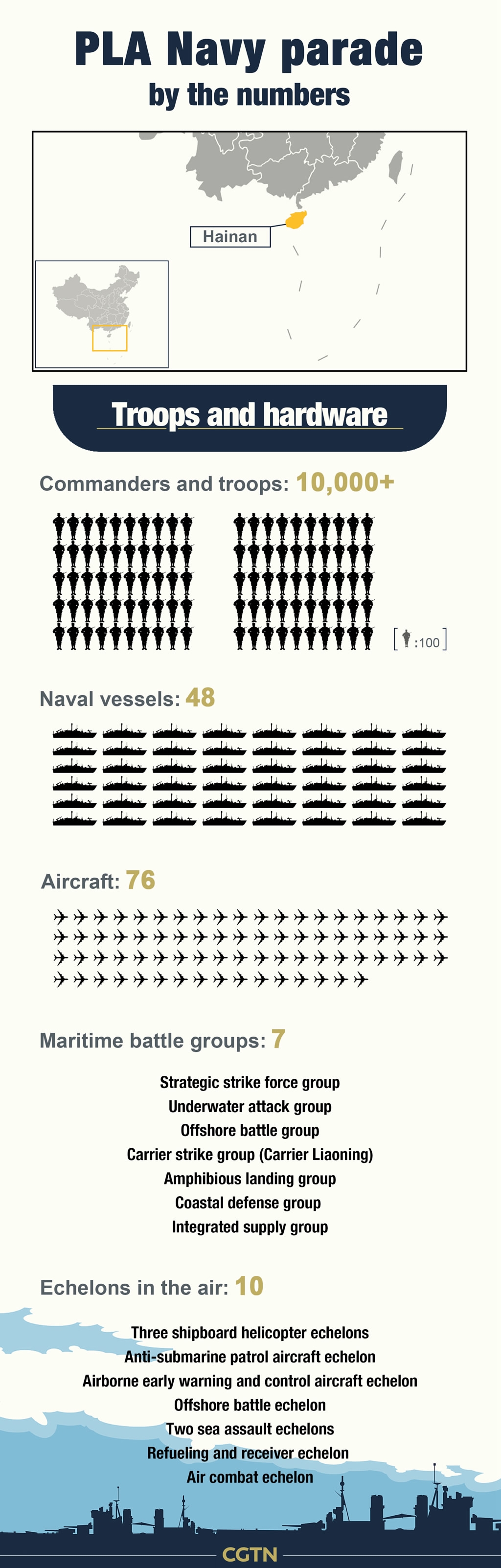 Seven maritime battle groups and 10 air combat formations, which consist of 48 naval vessels, 76 aircraft and more than 10 thousand PLA troops, were showcased during the review. Each and every one of them represents a point of strength in the PLA Navy.