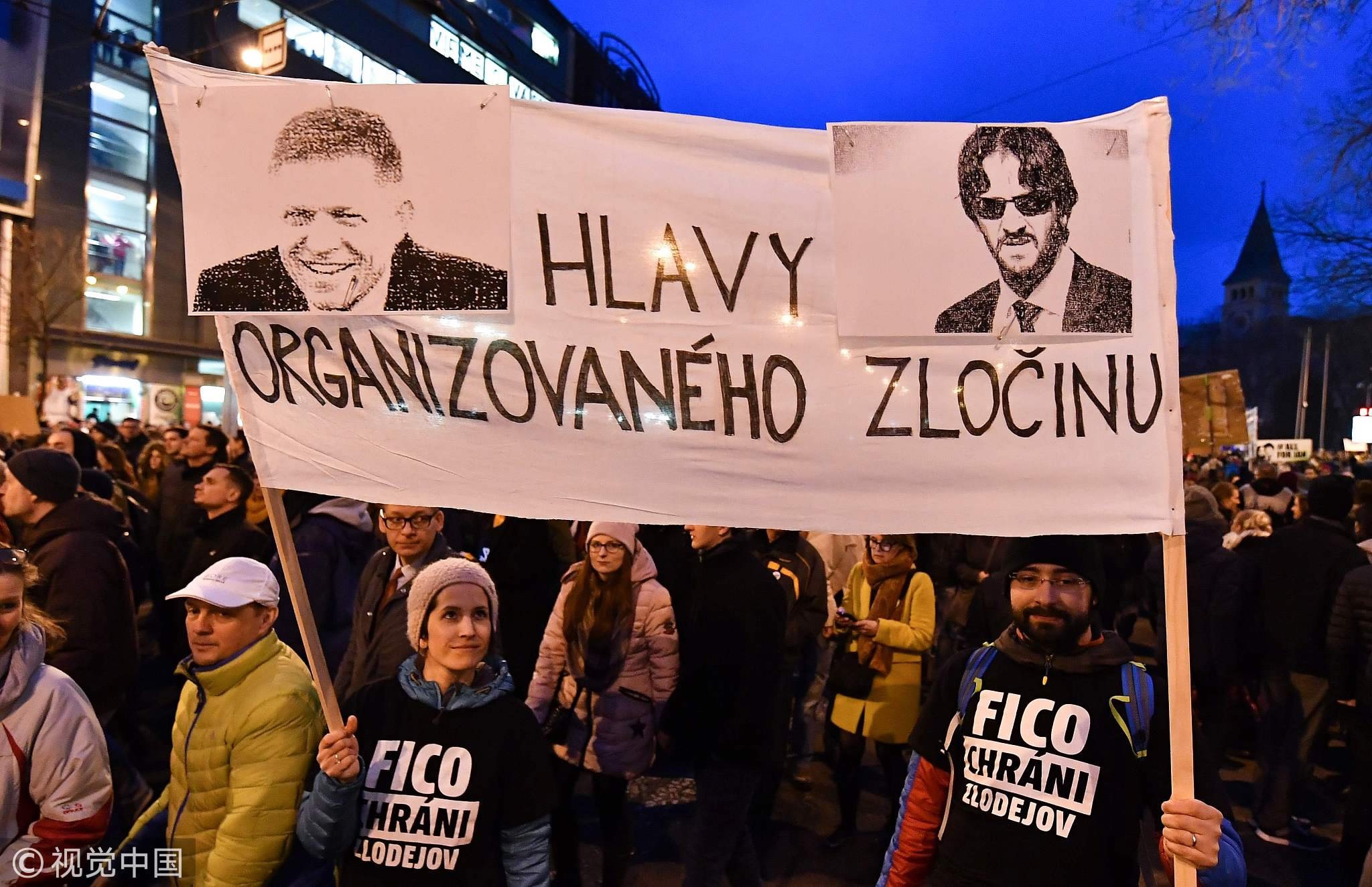 People carry a banner showing Prime Minister Robert Fico and Interior Minister Robert Kalinak, March 9, 2018, at the Slovak National Uprising (SNP) square in Bratislava, Slovakia. /VCG Photo