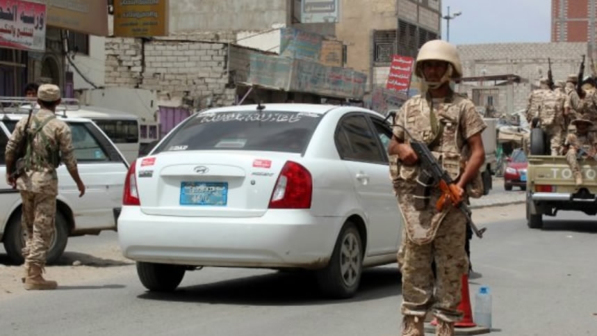 Loyalist forces stand guard on a main road in the Mansoura residential district of Yemen's second largest city of Aden. /AFP file picture
