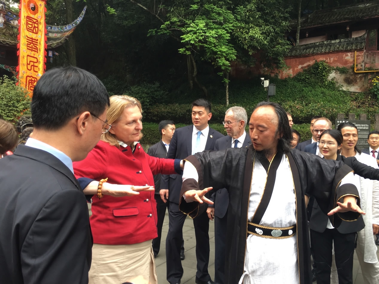 After the ceremony, the delegation visited the Qingcheng Mountain and the giant panda conservation center. The scenery is one of the birthplaces of Taoism in China. When the Austrian delegation arrived at Taoist temple Jianfu Palace, the visitors witnessed a special welcoming and praying ceremony.