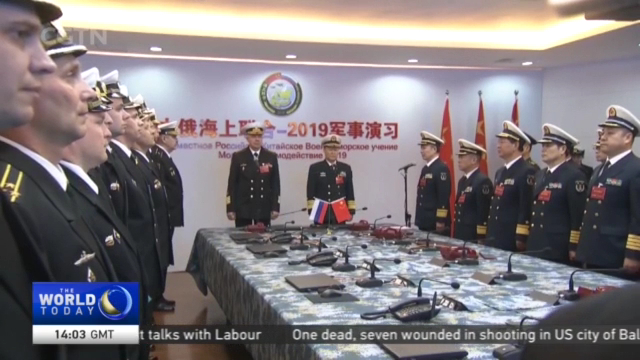 A joint military exercise by the Chinese and Russian navies is underway off the coast of Qingdao in eastern China's Shandong Province. The week-long drills kick off with both sides formally greeting each other. CGTN reporter Zheng Yibing has more.