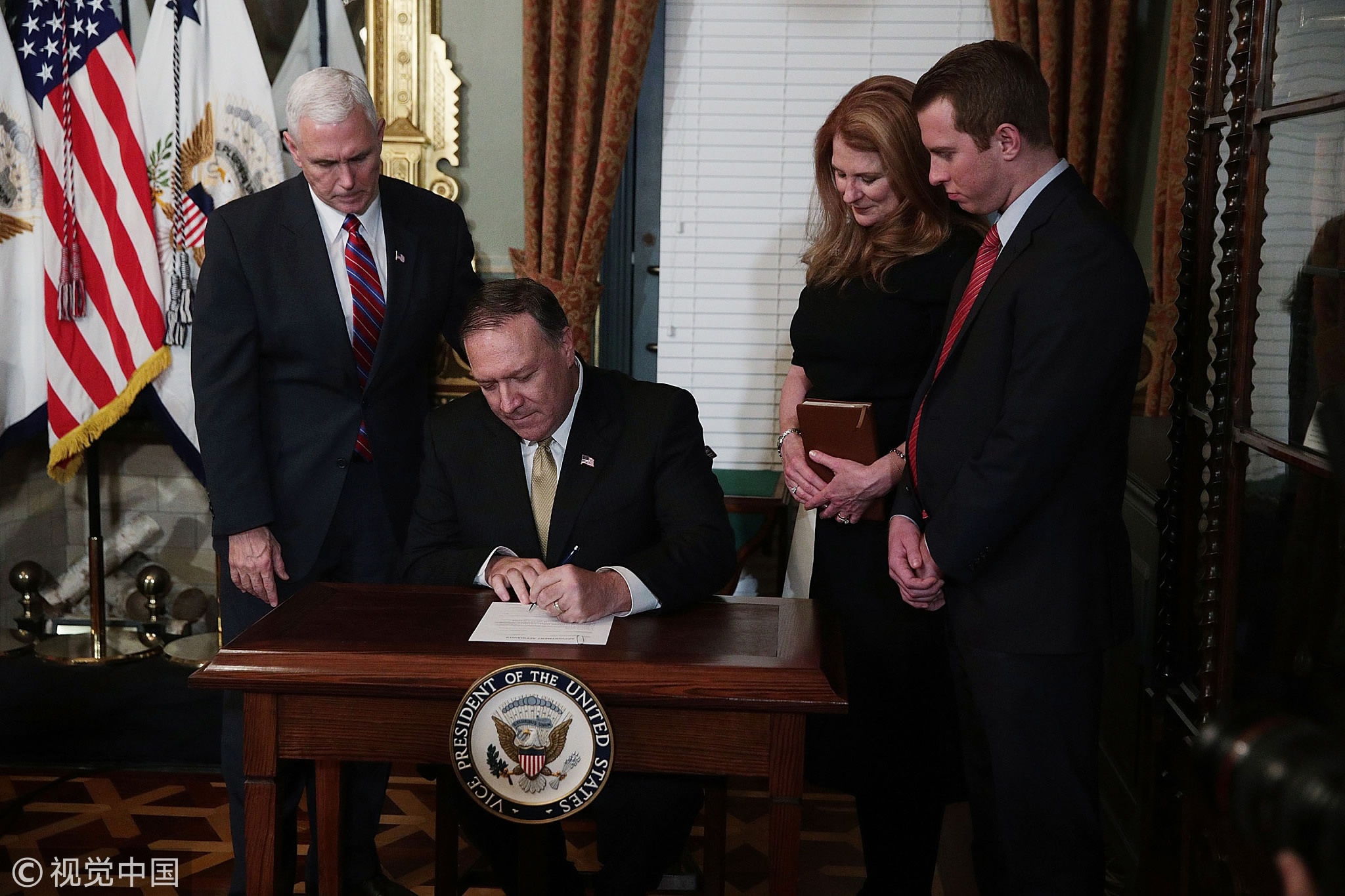 Mike Pompeo (2nd L) signs the affidavit of appointment during a swearing in ceremony for Pompeo to become CIA Director at Eisenhower Executive Office Building January 23, 2017 in Washington, DC. /VCG Photo