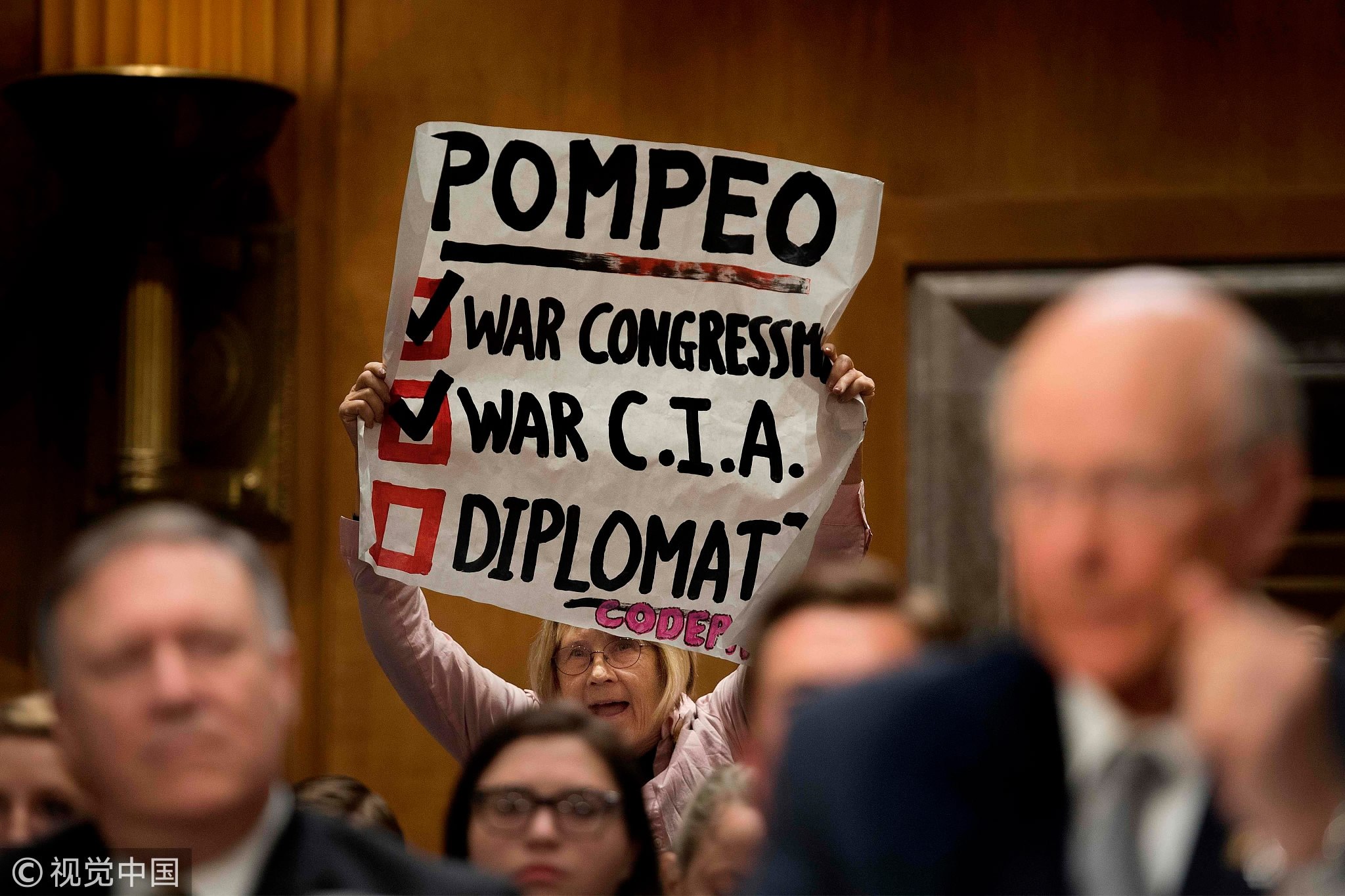 A protester from CodePink holds up a placard and shouts as Secretary of State nominee Mike Pompeo testifying before the Senate Foreign Relations Committee during his conformation hearing on Capitol Hill in Washington, DC, on April 12, 2018. /VCG Photo