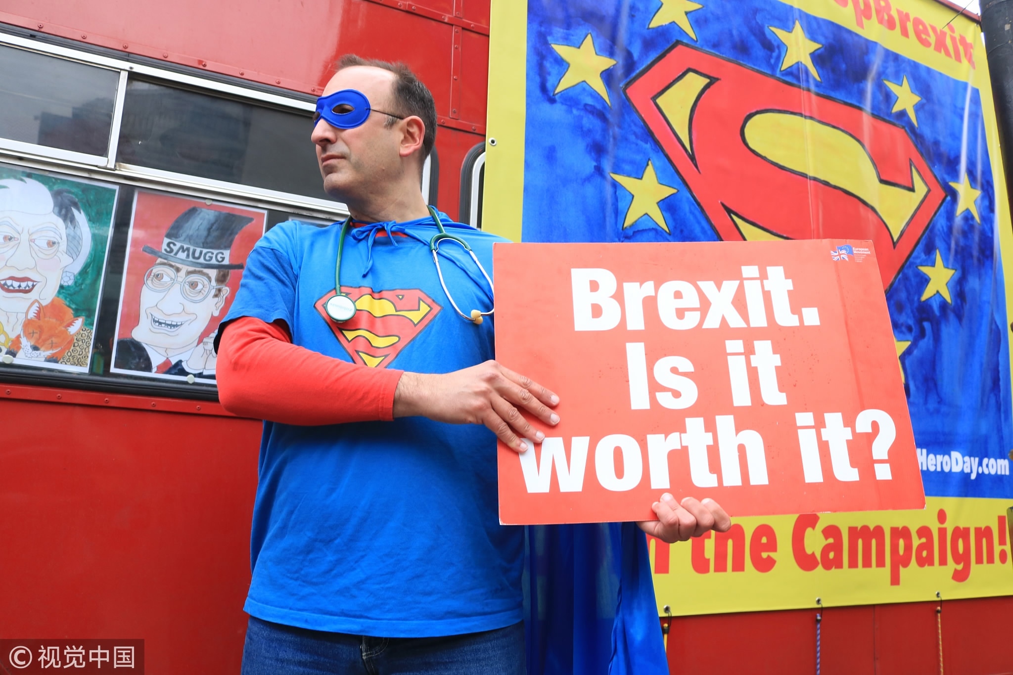 Pro-Europe protesters prepare to board a bus to bring their anti-Brexit message on "EU Superhero day" on the first anniversary of Article 50 being triggered for Britain to leave the European Union, March 28, 2018, London, England. /VCG Photo