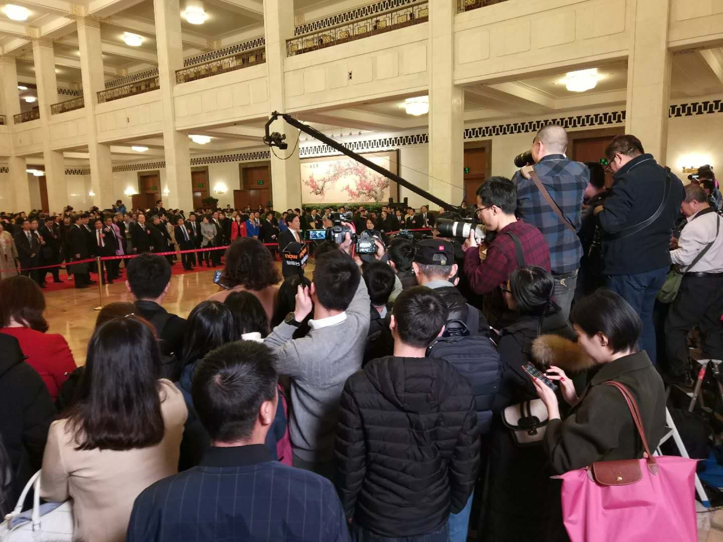 Reporters gather at the Deputies' Corridor at the Great Hall of the People in Beijing, China on March 9, 2018. /Photo by Sim Sim Wissgott