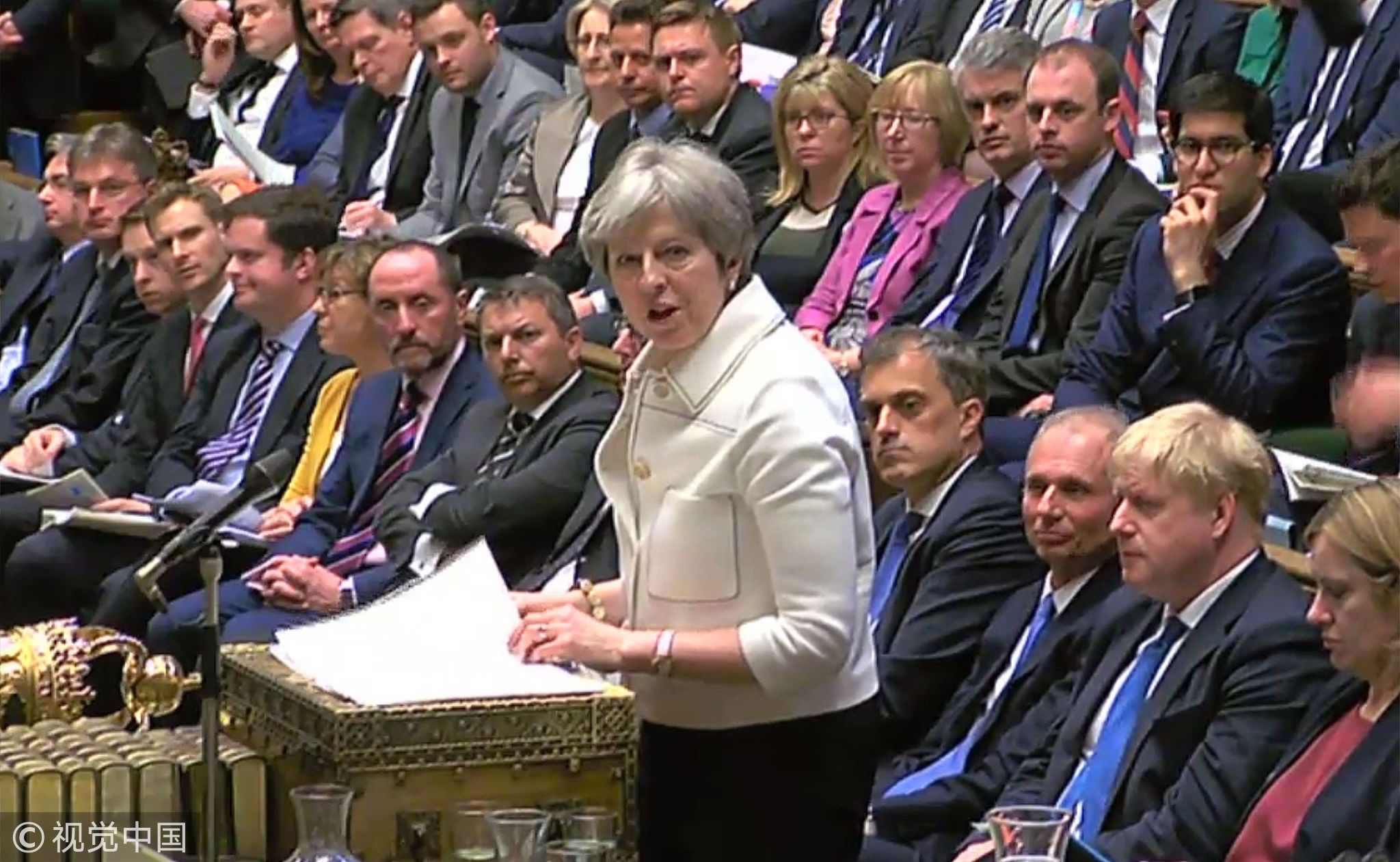 A video grab from footage broadcast by the UK Parliament's Parliamentary Recording Unit shows UK Prime Minister Theresa May making a statement following British participation in air strikes on Syria in the House of Commons in central London, April 16, 2018. /VCG Photo