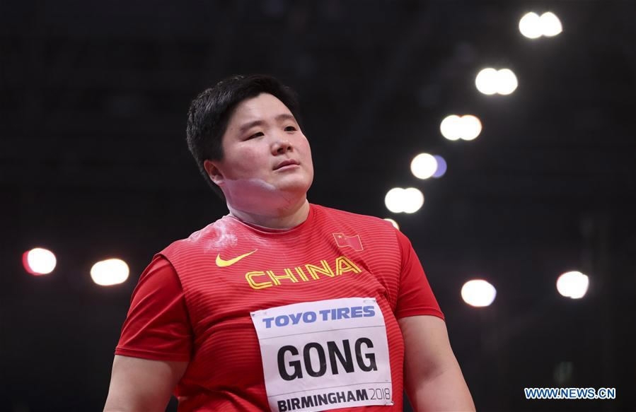 Gong Lijiao of China competes in the women's shot put final during the IAAF World Indoor Championships at Arena Birmingham in Birmingham, Britain on Mar. 2, 2018. Gong Lijiao took the third place with 19.08m. /Xinhua Photo