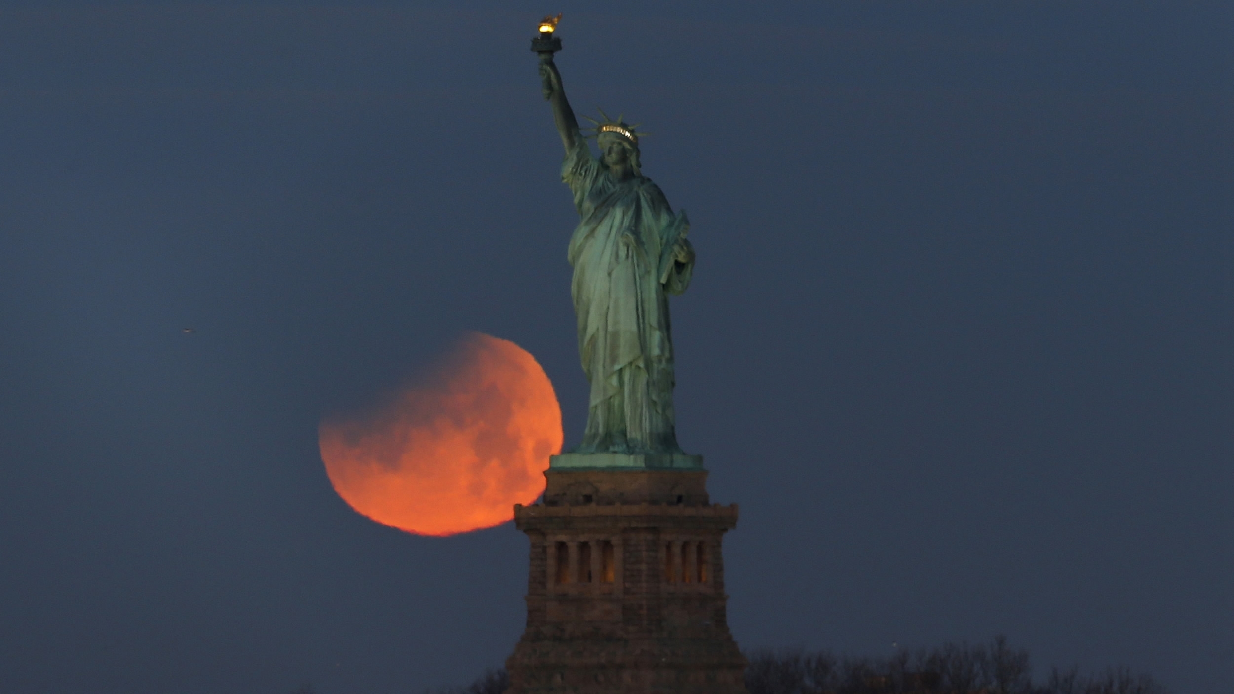 The all-in-one supermoon was partially eclipsed as it set beside the Statue of Liberty in New York City. /VCG Photo