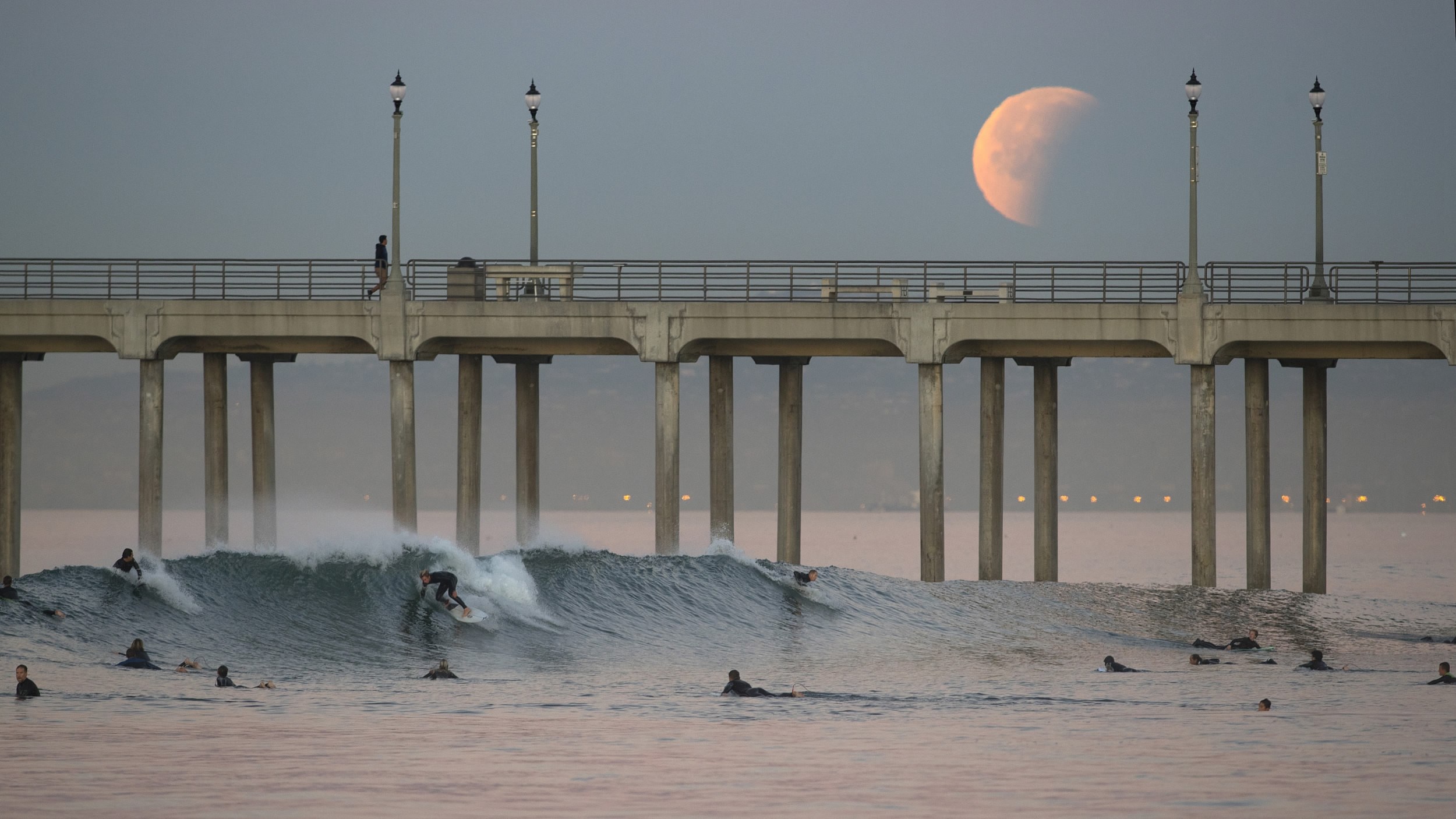 Surfers rode on the wave as the super blue blood moon eclipse set over the Huntington Beach pier in California, US. /VCG Photo
