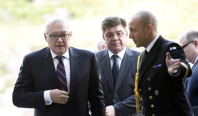 Deputy Foreign Minister of the Russian Federation Sergei Ryabkov and Ambassador of Russian Federation Pavel Kuznetsov arrive to meeting with President of Finland Sauli Niinisto at the President's Official Residence Mantyniemi, Helsinki, Finland Sept. 12, 2017. /VCG Photo